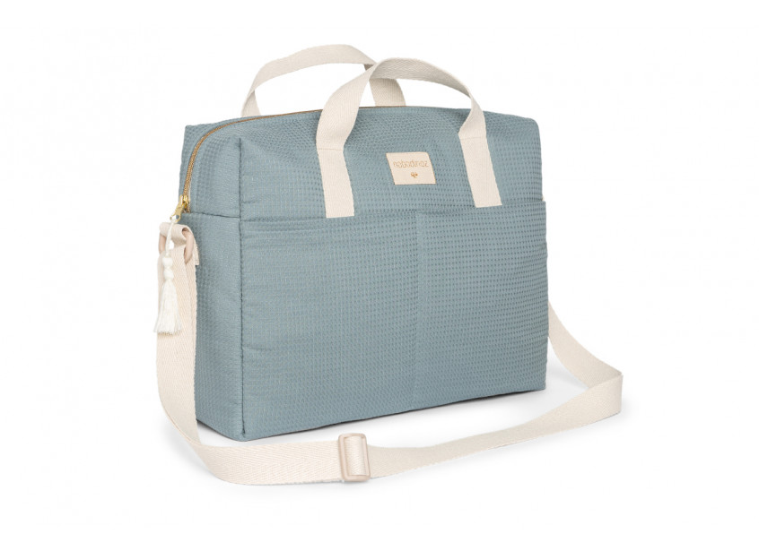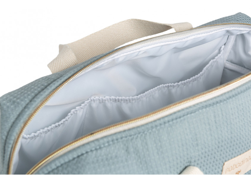 Le sac Gala en coton bio a le format idéal et s’accroche à la poussette. C’est le sac parfait pour vos sorties quotidiennes en famille. Son intérieur imperméable équipé de deux poches vous permettra de ranger tout le nécessaire pour votre bébé. Vous pourrez aussi glisser dans les deux poches extérieures les petits détails que vous aimez garder à portée de main. Grâce à son système de double anses en tresse de coton, vous pouvez le porter à la main, à l’épaule ou encore l’accrocher à la poussette pour plus de liberté. • nid d’abeille de coton bio avec doublure…