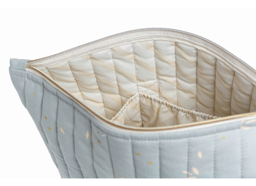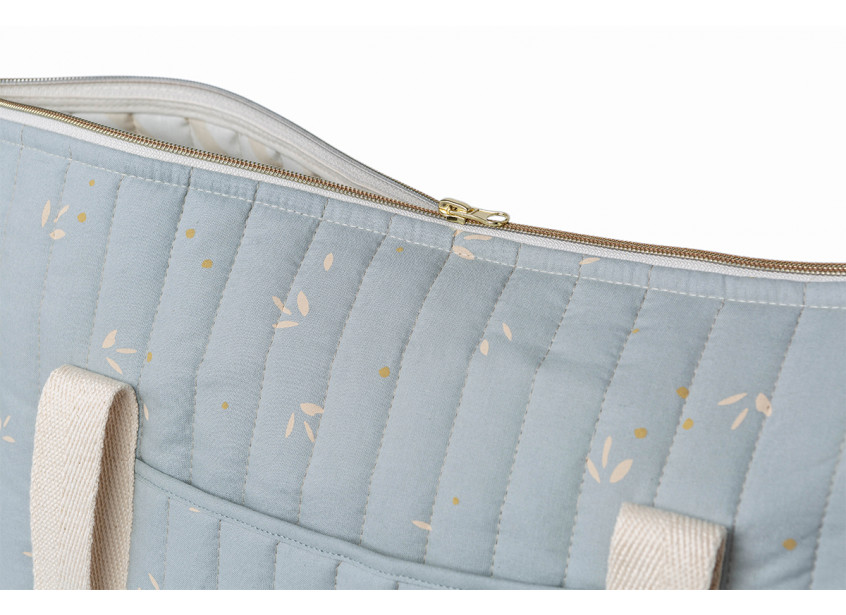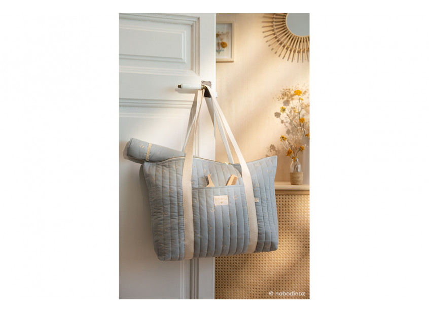 Le sac à langer Paris sera l’allié idéal pour vos sorties avec bébé. Fabriqué en popeline de coton bio, sa doublure deperlante et ses nombreuses poches vous permettront de transporter les produits de votre bébé en toute tranquilité. Il ferme grâce à une fermeture éclair et peut se porter à l’épaule grâce à ses deux grandes anses confortables. • Popeline de coton bio matelassée et doublure déperlante • 1 poche plaquée extérieure et 3 poches intérieures • Fermeture éclair • Anses en tresse de coton