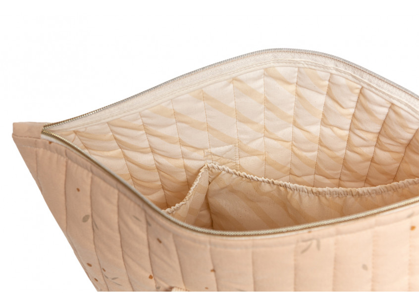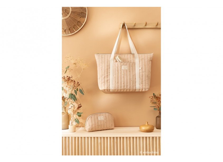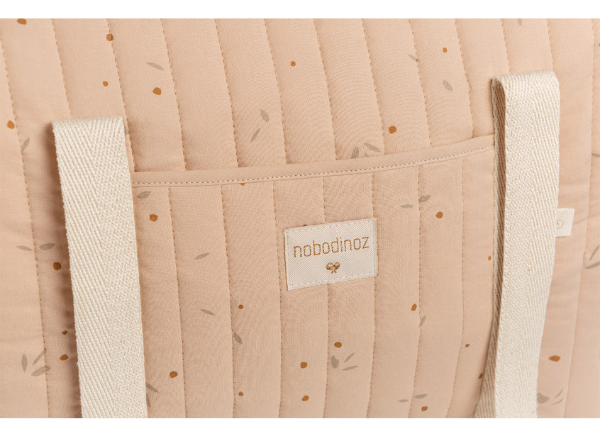 Le sac à langer Paris sera l’allié idéal pour vos sorties avec bébé. Fabriqué en popeline de coton bio, sa doublure deperlante et ses nombreuses poches vous permettront de transporter les produits de votre bébé en toute tranquilité. Il ferme grâce à une fermeture éclair et peut se porter à l’épaule grâce à ses deux grandes anses confortables. • Popeline de coton bio matelassée et doublure déperlante • 1 poche plaquée extérieure et 3 poches intérieures • Fermeture éclair • Anses en tresse de coton