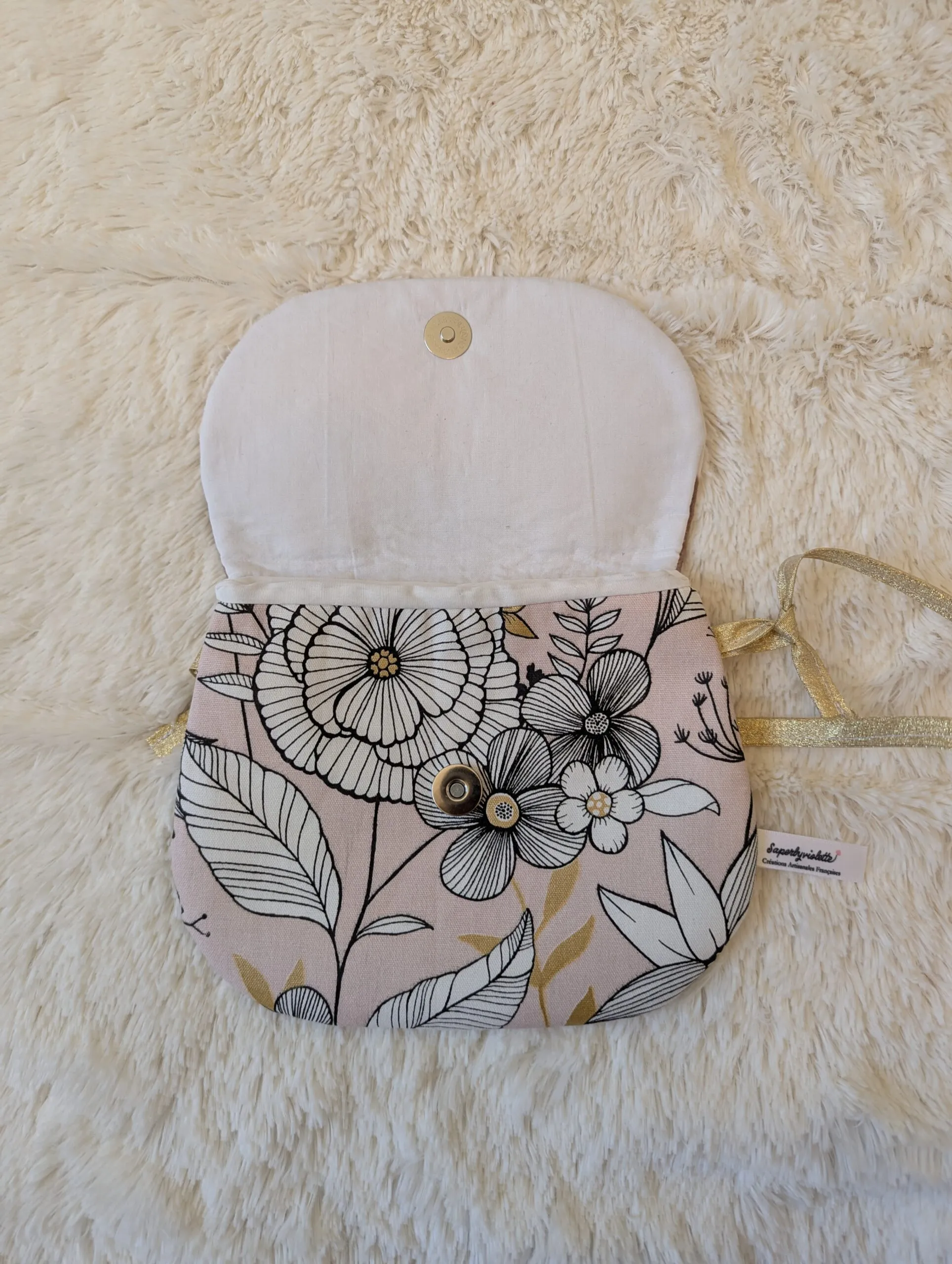 Rabat en suédine et coton (doublé molleton), fermeture par pression aimanté, bandoulière à nœud (vous pouvez ainsi jouer sur la longueur pour un porté épaule ou bandoulière).