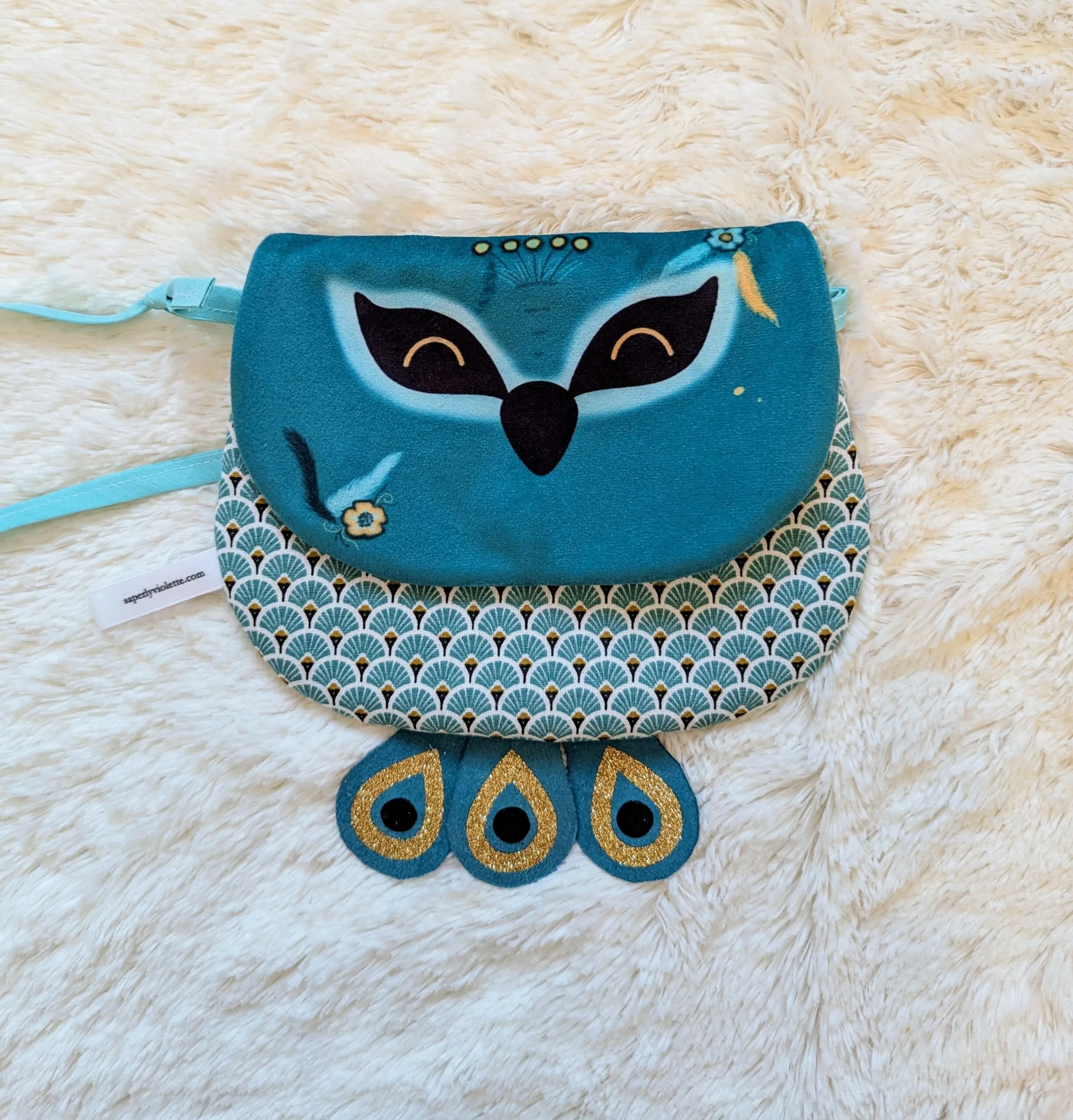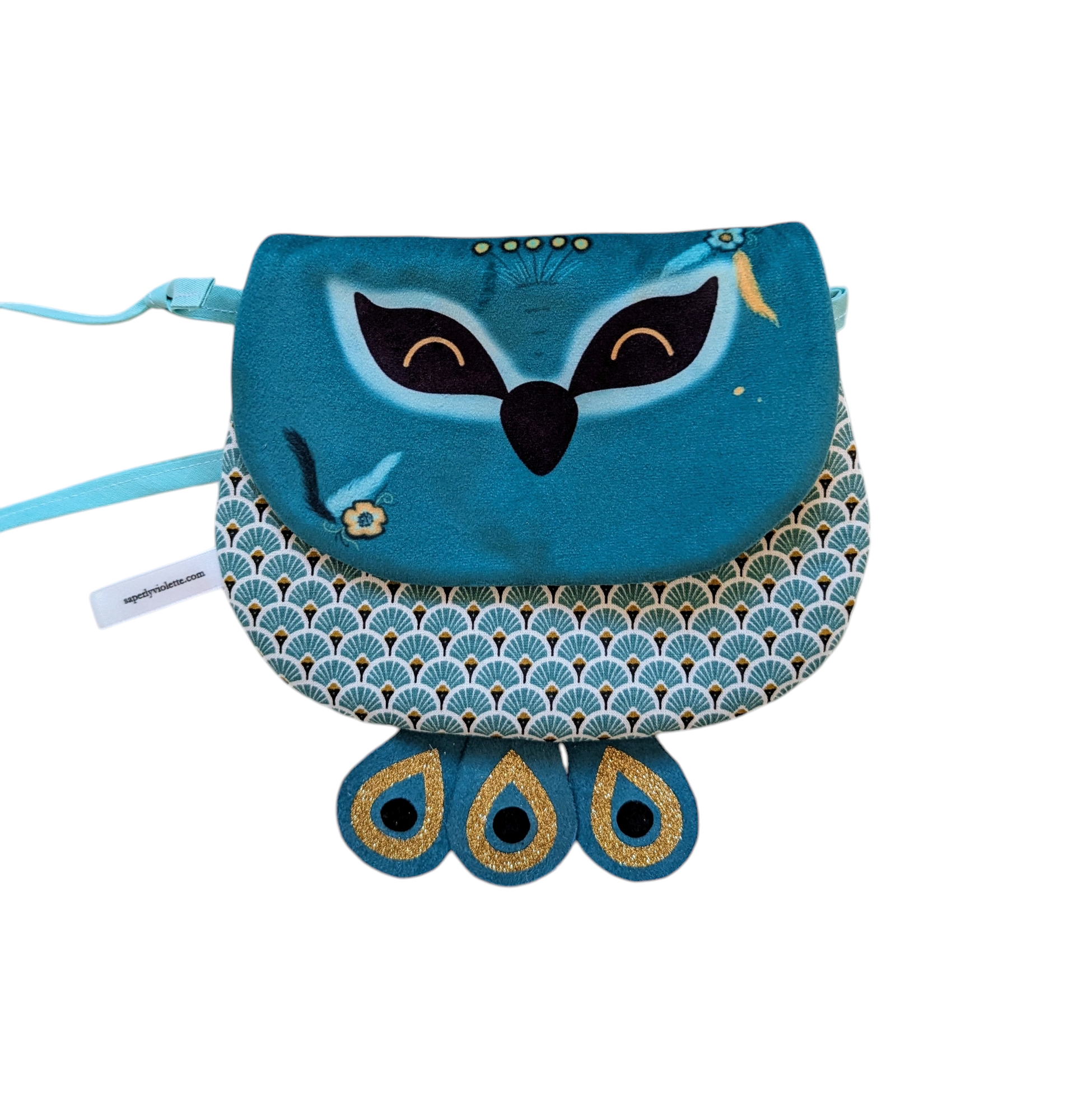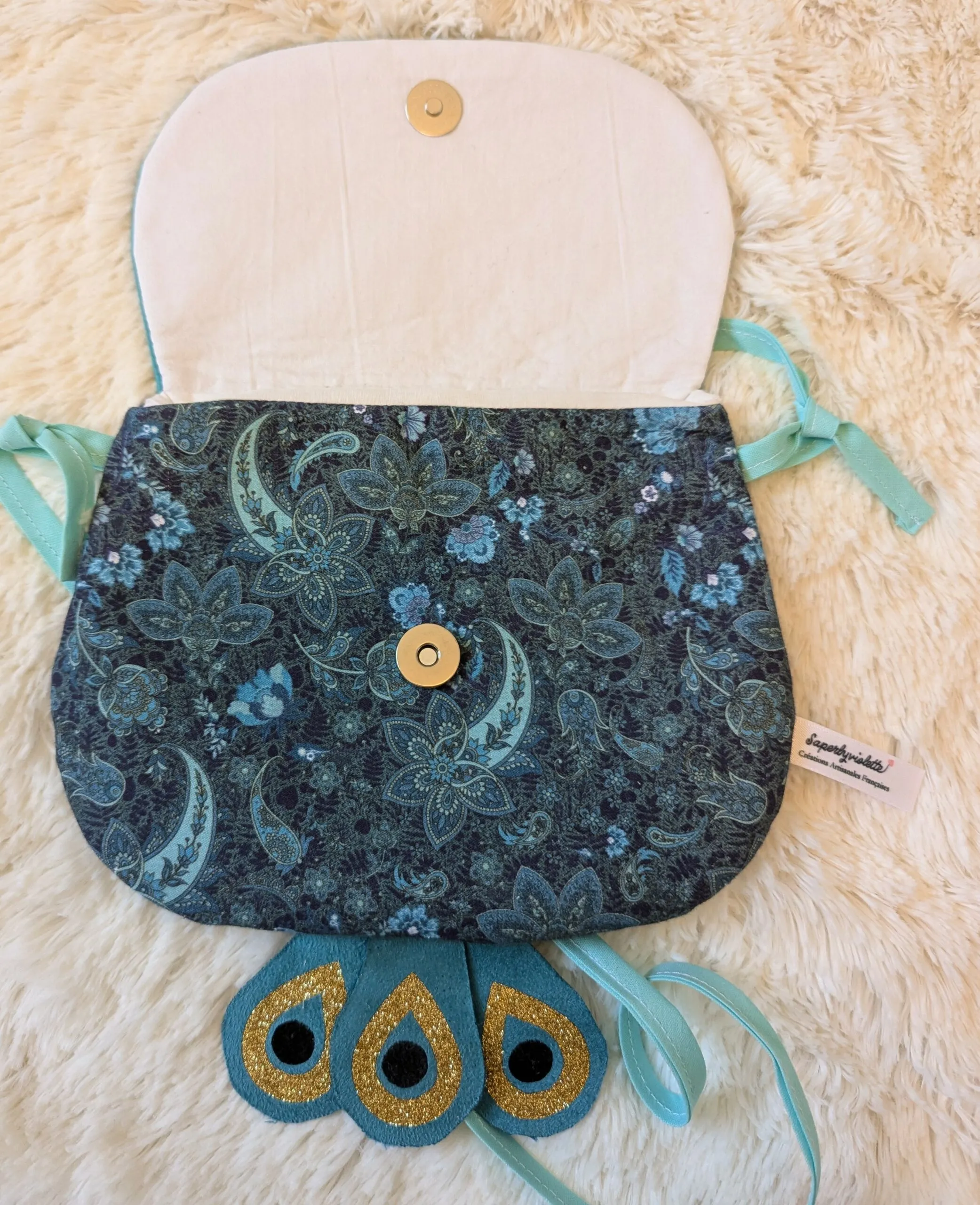 Sac à main fillette. Modèle Léon le paon et ses belles couleurs. Détails or et menthe thermocollés.