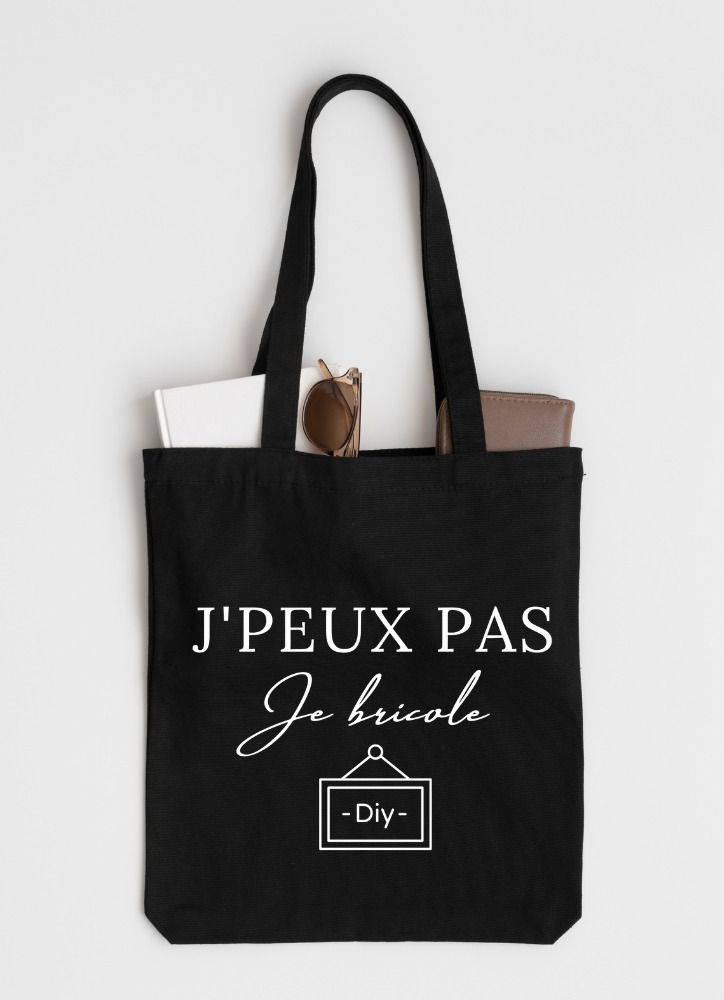 Le design du Sac fourre-tout j’peux pas je bricole DIY avec son slogan, affirme votre passion pour le bricolage. Fabriqué en coton de qualité, il est prévu pour durer, il vous accompagnera dans vos nombreuses aventures créatives à venir.