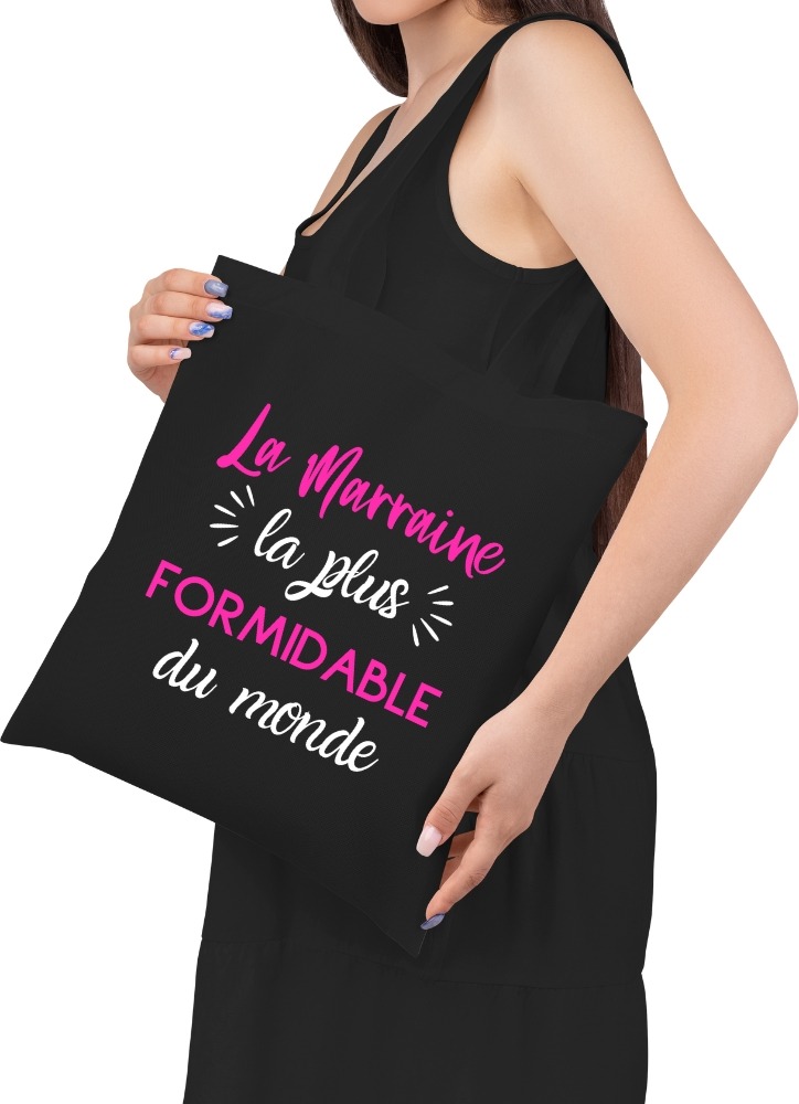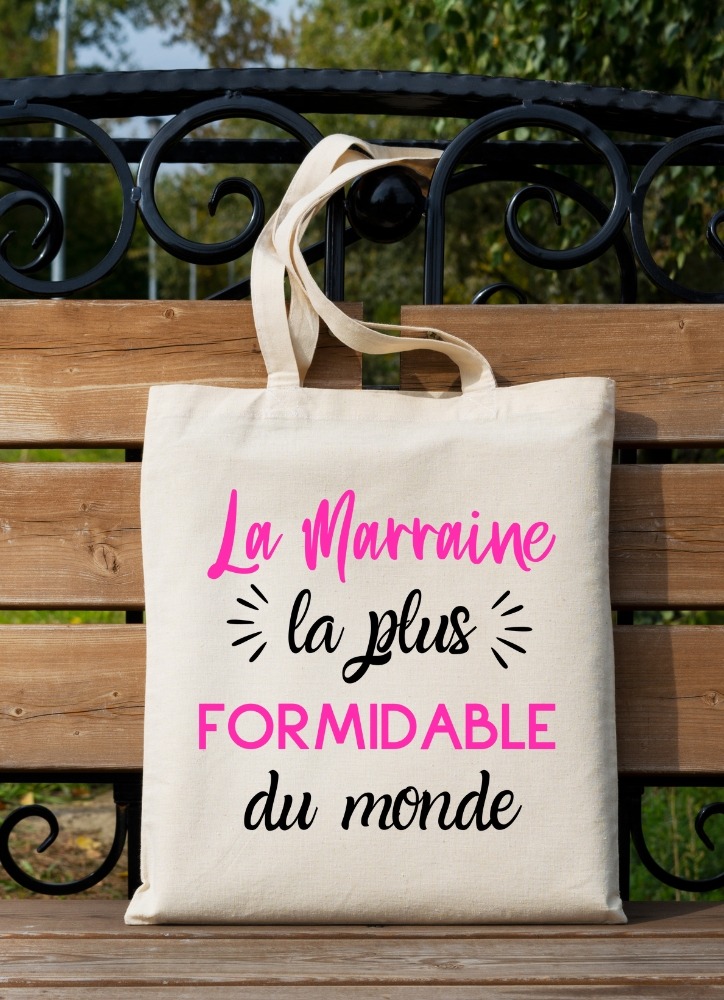 Sac fourre-tout, marraine formidable, cadeau anniversaire, cadeau Noël, réunion de famille, coton, accessoire pratique, gratitude, polyvalent, durable.