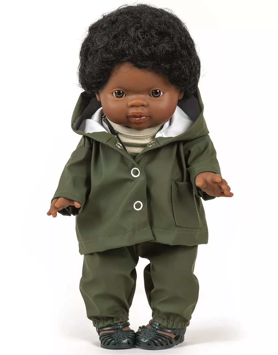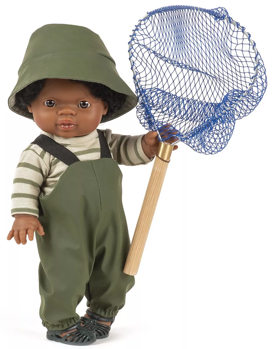 Salopette de pĂȘcheur en enduit avec bretelles Ă©lastiques pour poupĂ©es et poupons Minikane Gordis 34 & 37cm. Design, dĂ©veloppement & confection made in France. Design, development & tailoring made in France.