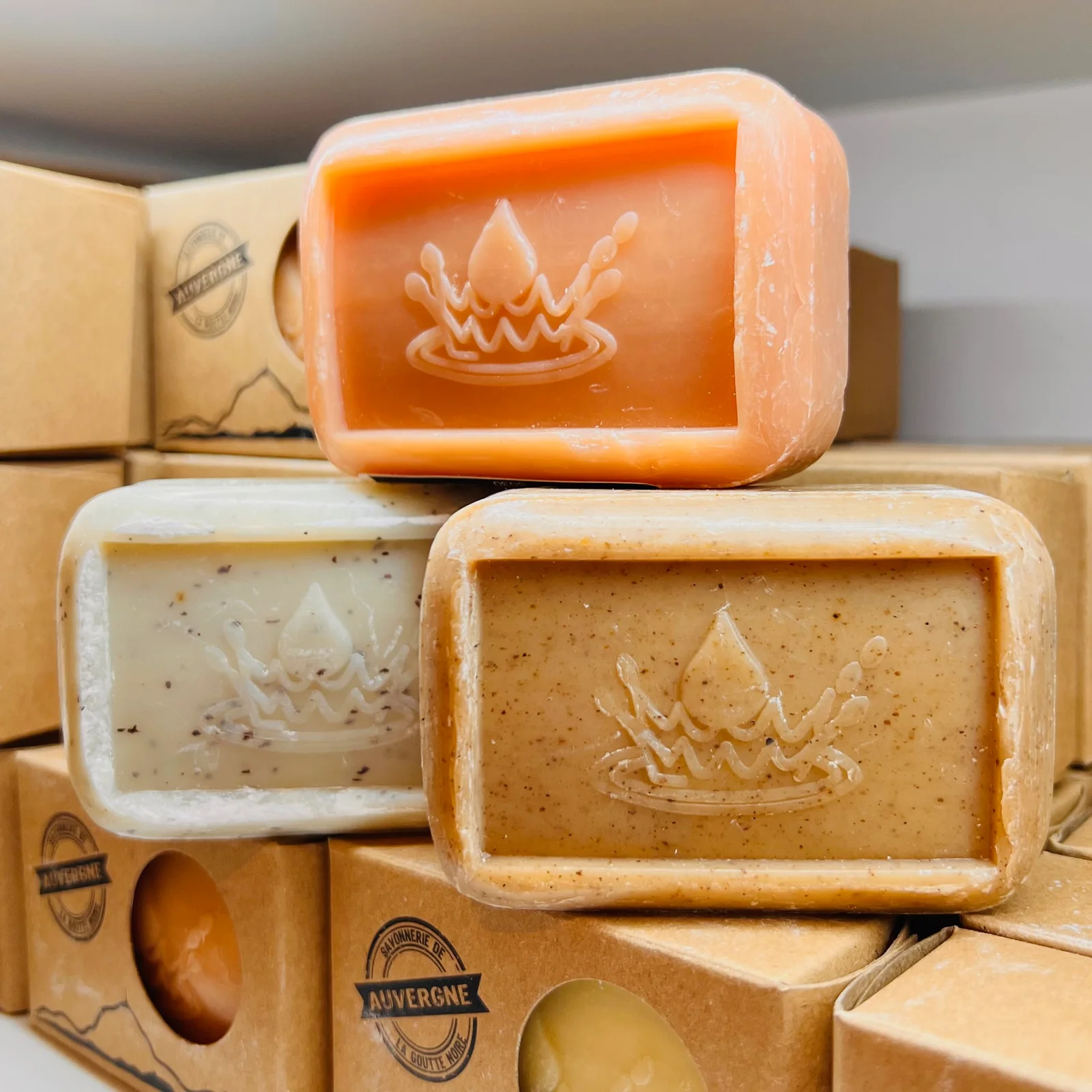 Savons gommants de 100g moulés, Savonnerie de la Goutte Noire.