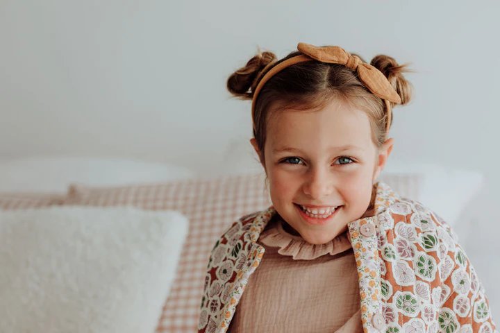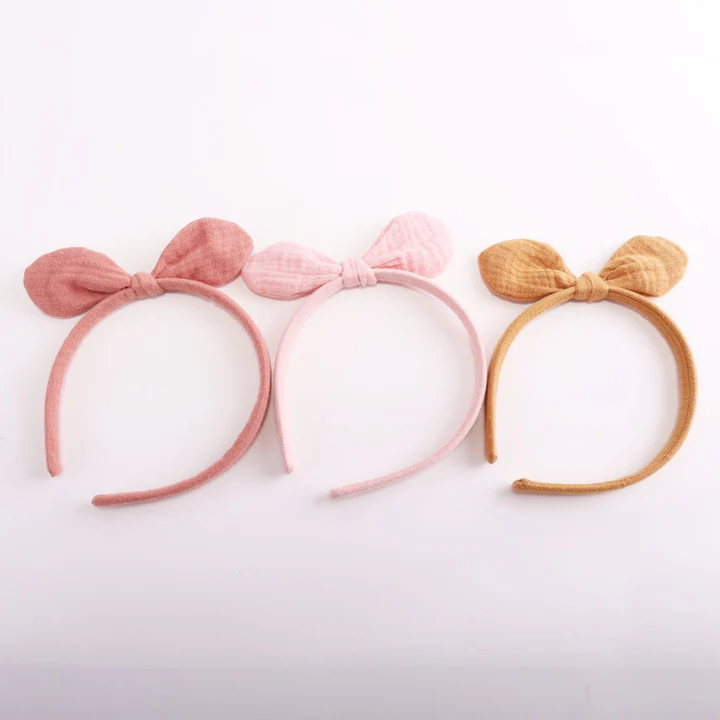 Ce serre-tête en double gaze ambre permettra de maintenir facilement et avec élégance les cheveux des petites. Il est rehaussé d’un nœud amovible.