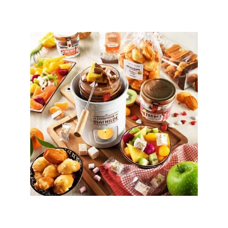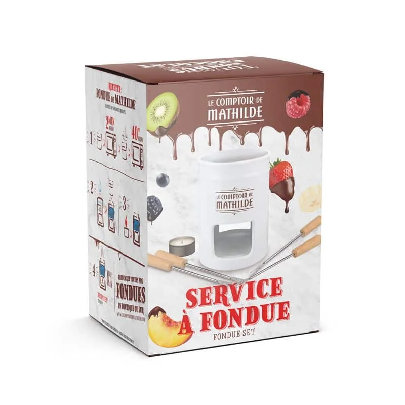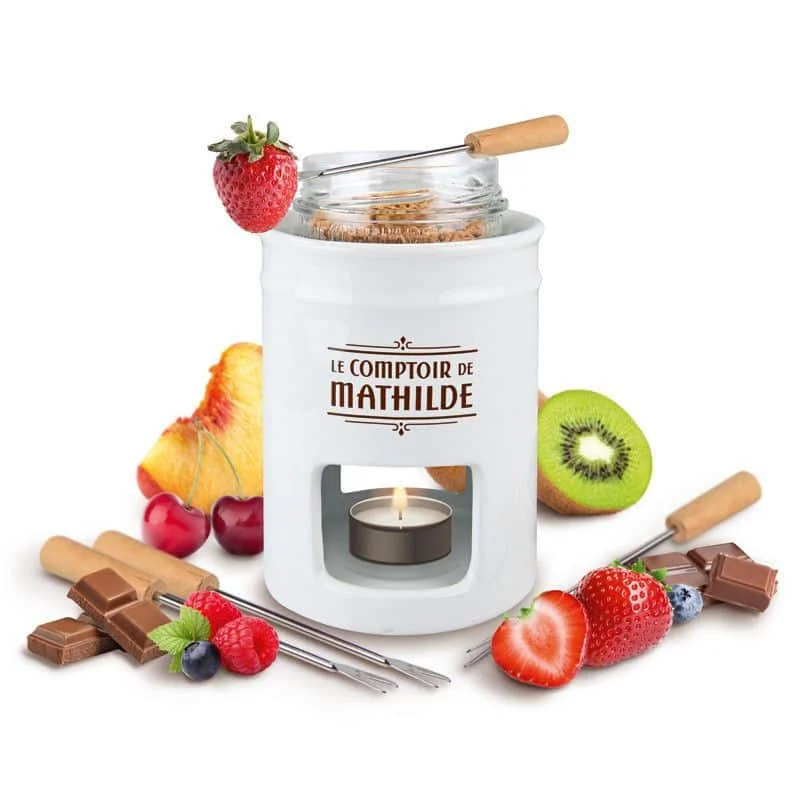 Service à Fondue, Le Comptoir de Mathilde. Touche de gourmandise à vos moments conviviaux avec le service à fondue en porcelaine ! Livré avec 4 piques, une bougie chauffe-plat et son mode d’emploi.