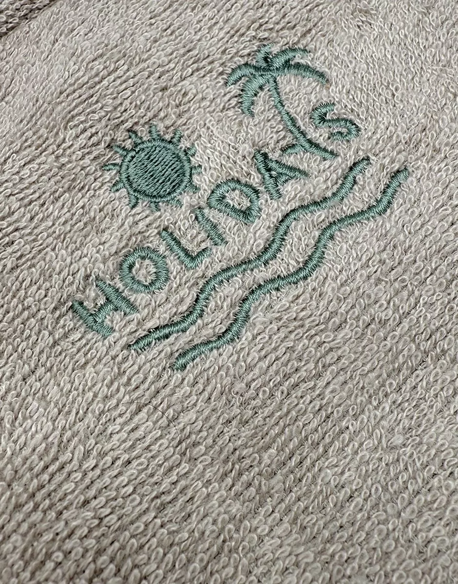 Serviette de plage en éponge avec broderie « Holydays » pour poupées et poupons Minikane. Design, développement & confection made in France. Design, development & tailoring made in France.