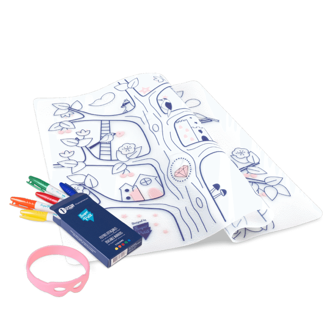 1 set en silicone + 5 feutres + 1 bracelet FACILE A NETTOYER – REUTILISABLE – A PARTIR DE 3 ANS Joue à cache cache avec les petits animaux dans l’univers secret de l’arbre magique !