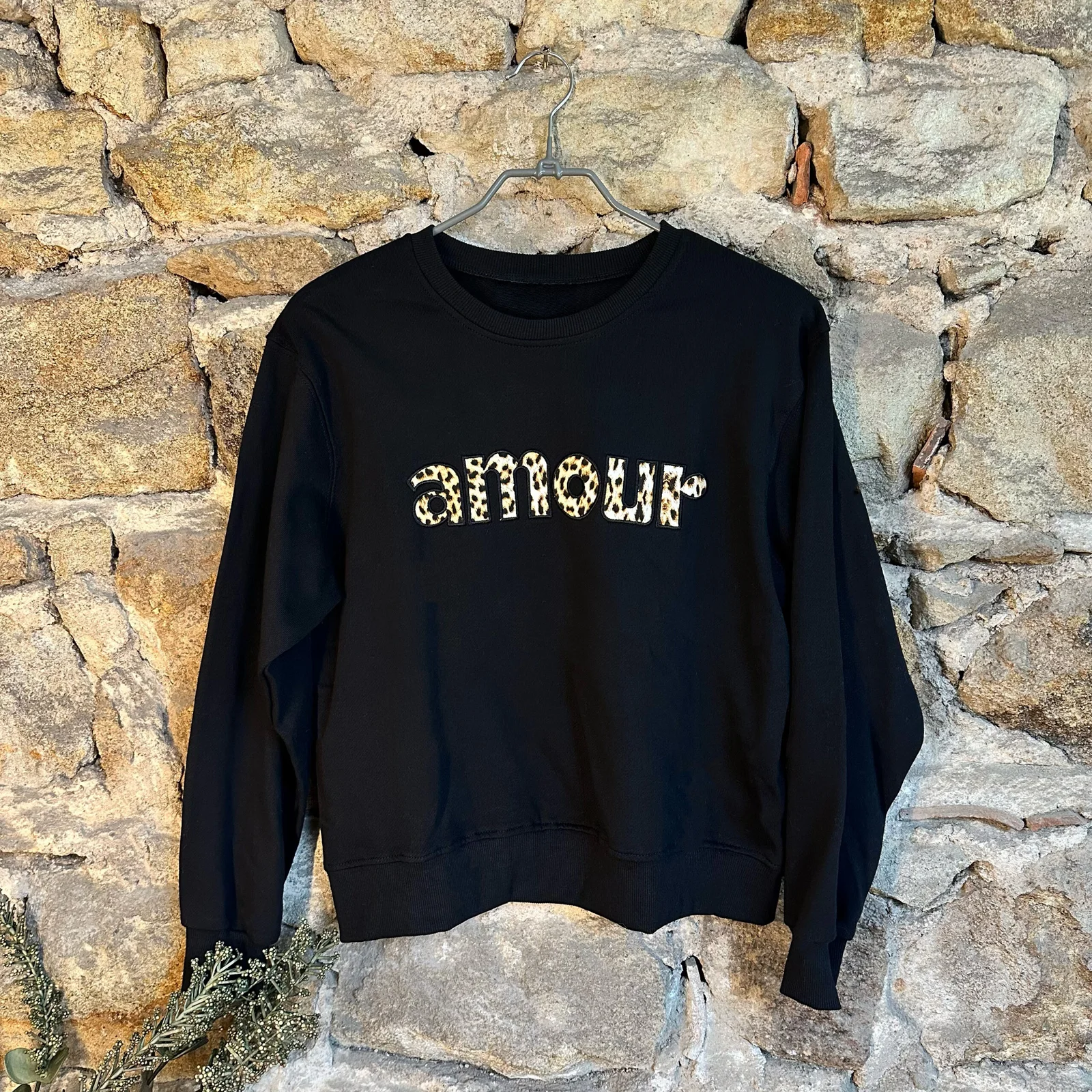 Sweat Noir Amour Léo Un joli sweat très tendance avec sa broderie léopard « amour ». Il viendra vous réchauffer avec un look cool et décontracté. Existe en deux tailles, S/M ou M/L.