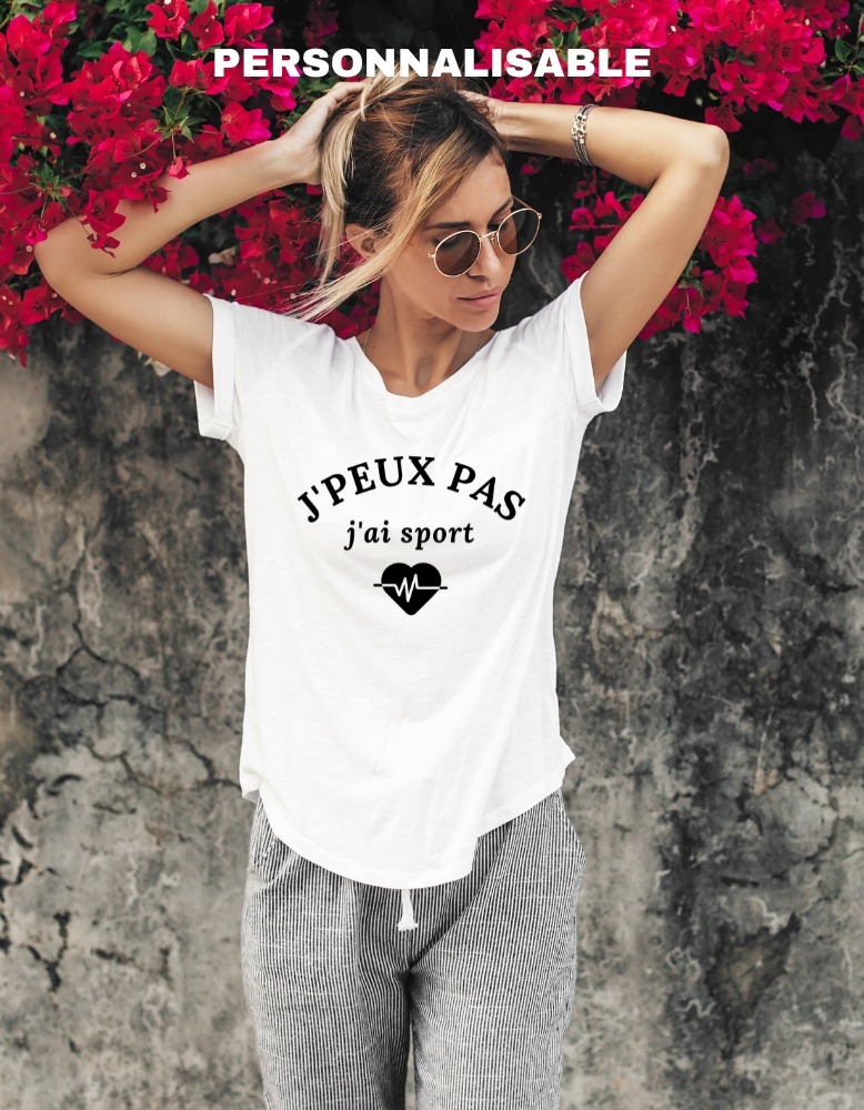 Ce T-shirt femme j’peux pas j’ai sport, est idéal pour vous rendre à l’entrainement. Ce t-shirt en plus d’être personnalisé partagera avec tous, votre amour du sport.