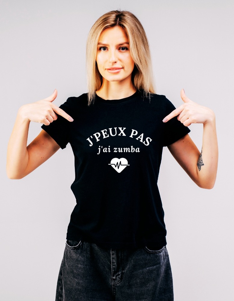 Ce T-shirt femme j’peux pas j’ai zumba, est idéal pour vous rendre à l’entrainement. Ce t-shirt en plus d’être personnalisé partagera avec tous, votre amour de la discipline.