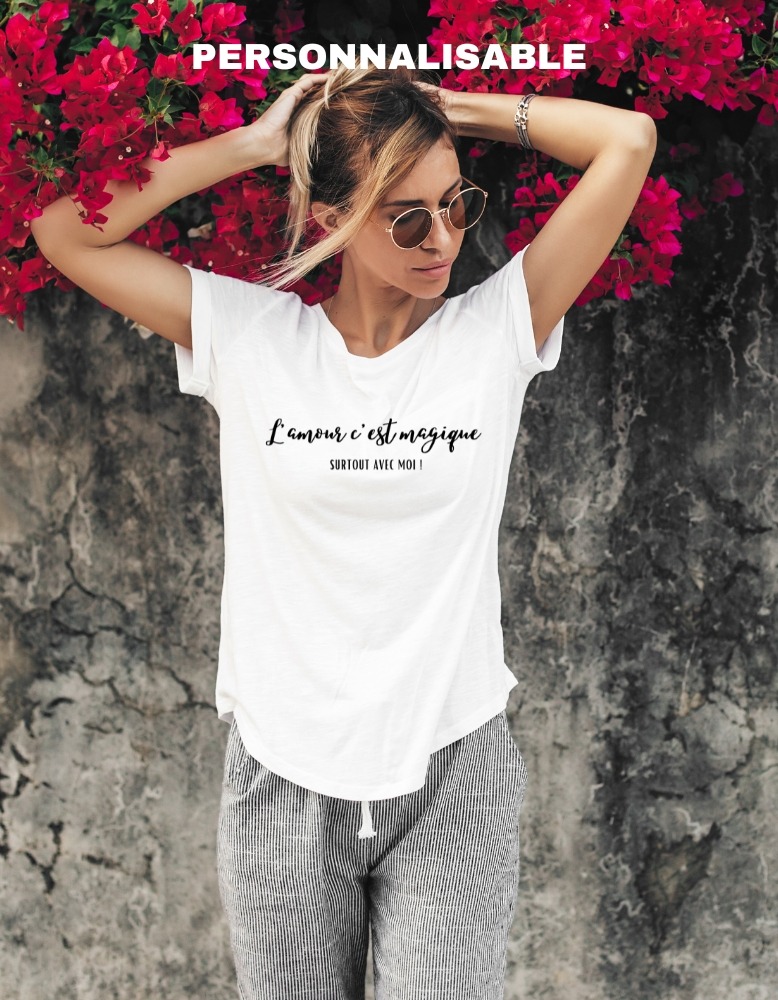 Par conséquent, on ne peut que craquer pour ce t-shirt personnalisé l’amour c’est magique, surtout avec moi, on fonce un modèle en col rond ou col V.