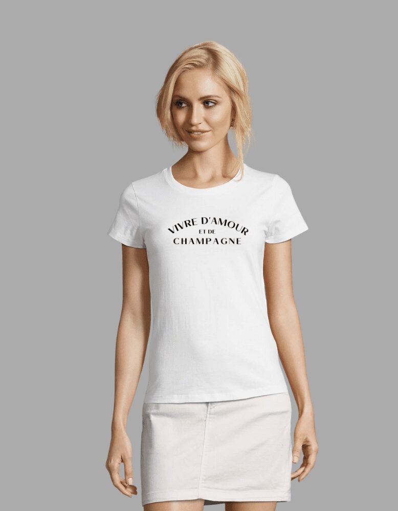 Ce T-shirt vivre d’amour et de champagne est idéal pour toutes les amoureuses de l »amour et du champagne