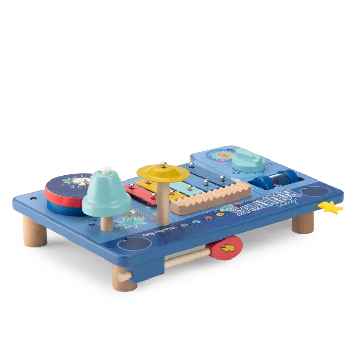 La table musicale Super Boumtchak Puce & Pilou offre une multitude d’activités sonores pour bébé : tambour, cymbale, billes à secouer, volume à tourner… Fabriquée en bois de schima et facilement transportable, elle stimule l’éveil musical et la motricité dès 18 mois.