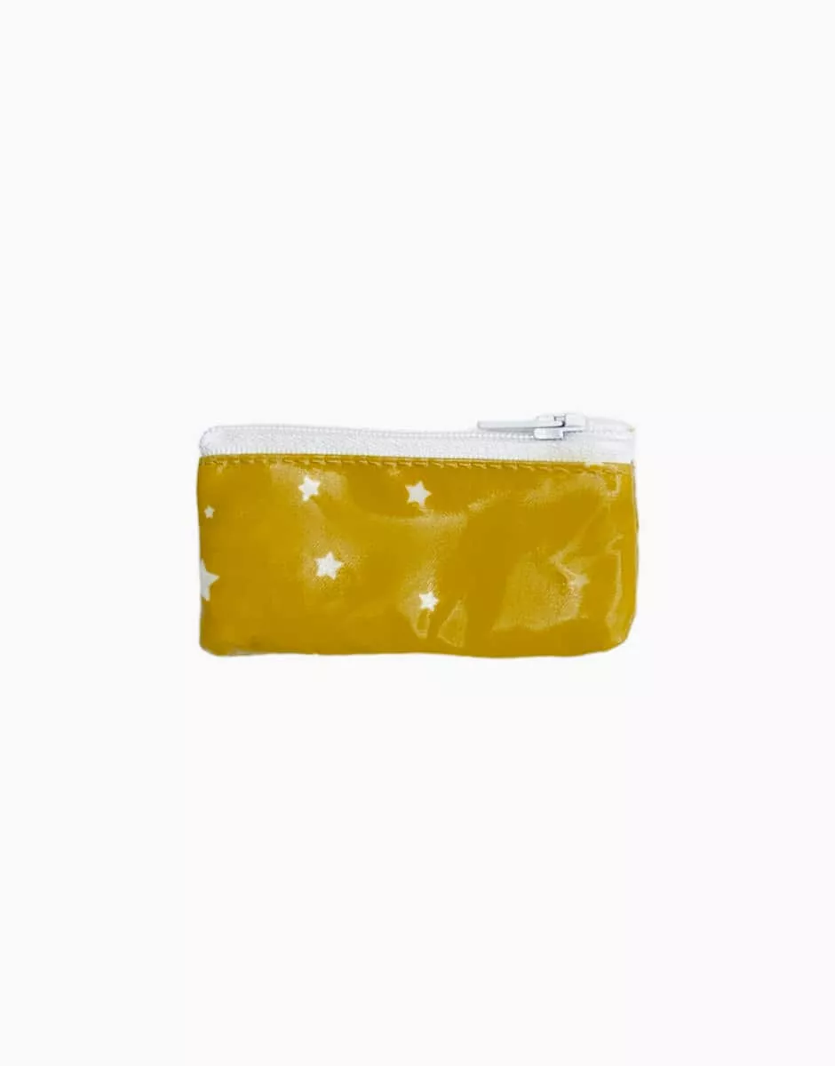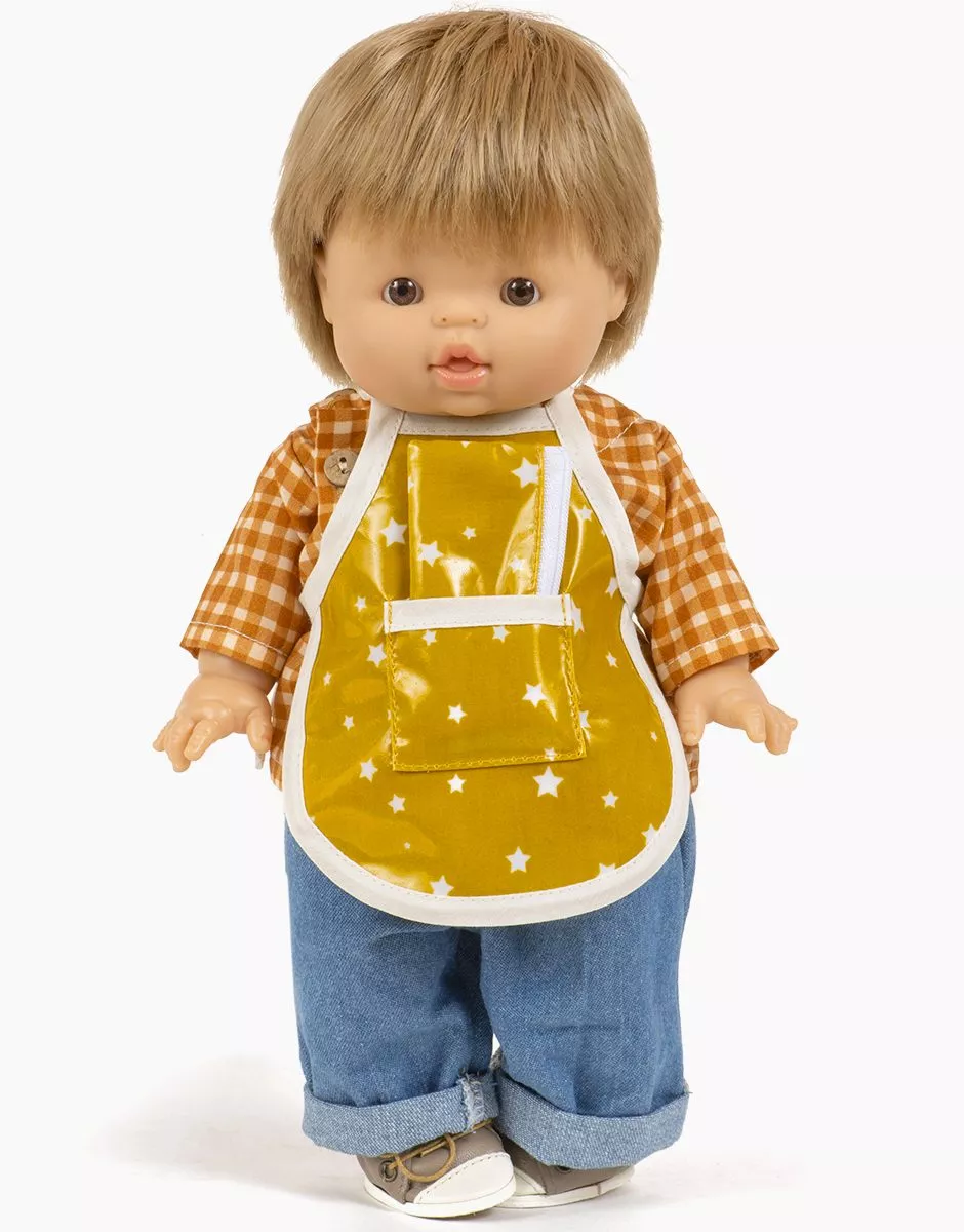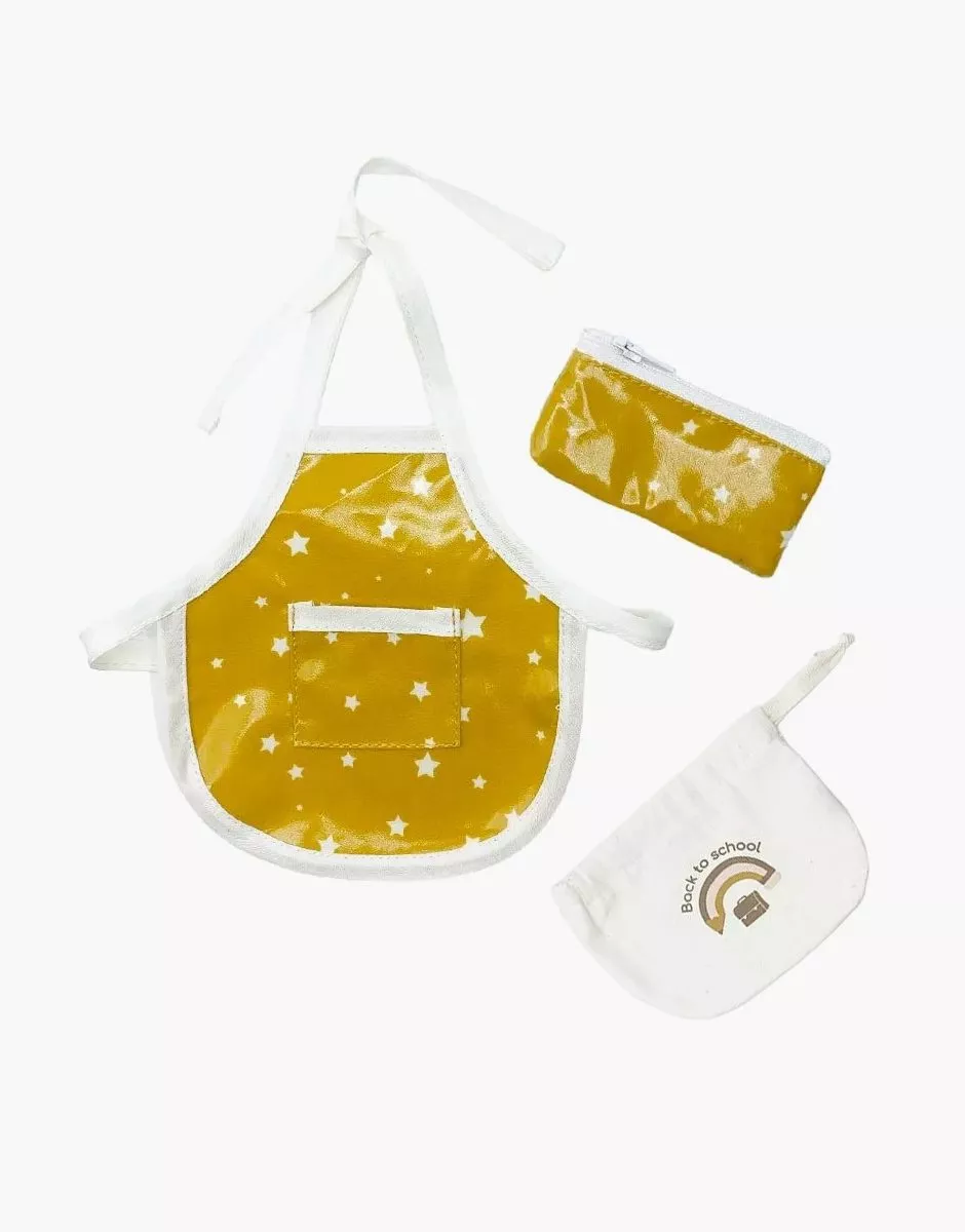 Tablier et trousse pour poupée en coton enduit Stars moutarde avec pochon écru