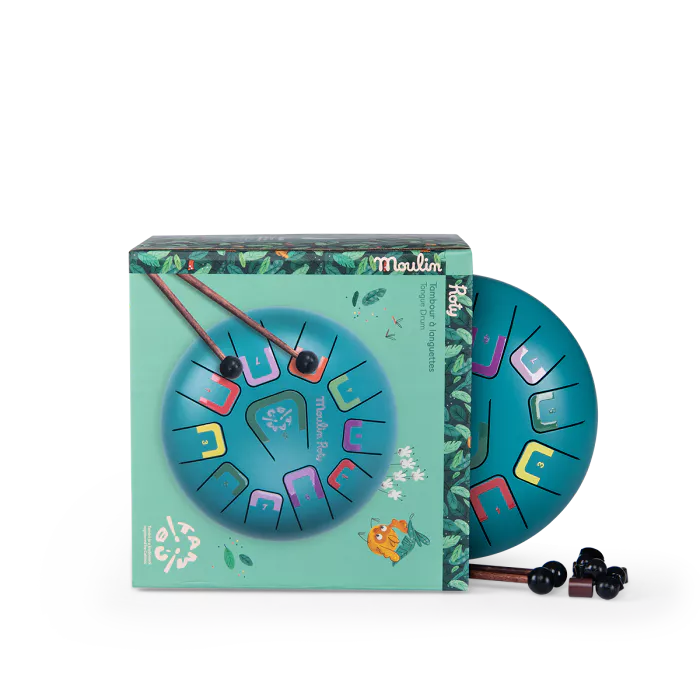 Tambour à Languettes Dans la Jungle, Moulin Roty Instrument pour familiariser les enfants aux percussions. 11 notes indiquées par une couleur et un chiffre pour jouer avec les mains, le bout des doigts ou à l’aide de baguettes. Inclus sac de transport, livret de mélodies, 2 baguettes et 4 pics à doigts.