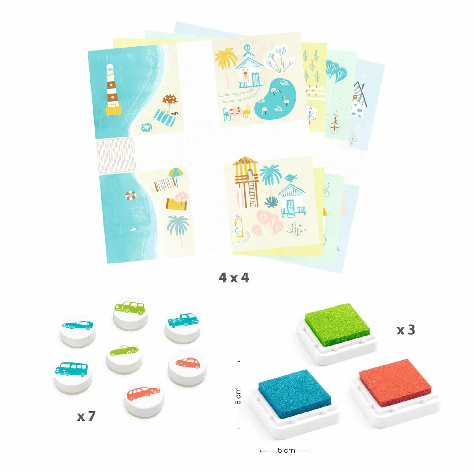 Contenu : 16 cartes illustrées à tamponner, 3 gros encreurs (bleu, vert, orange), 7 tampons et 1 livret explicatif pas à pas.