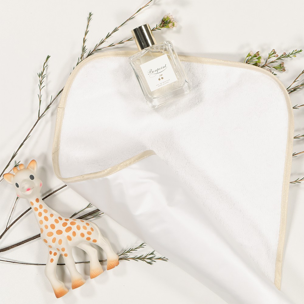 Tissu éponge moelleux 100% coton uni blanc 440gr/m2, doublure en tissu déperlant, biais poly-coton, pression nickel Free