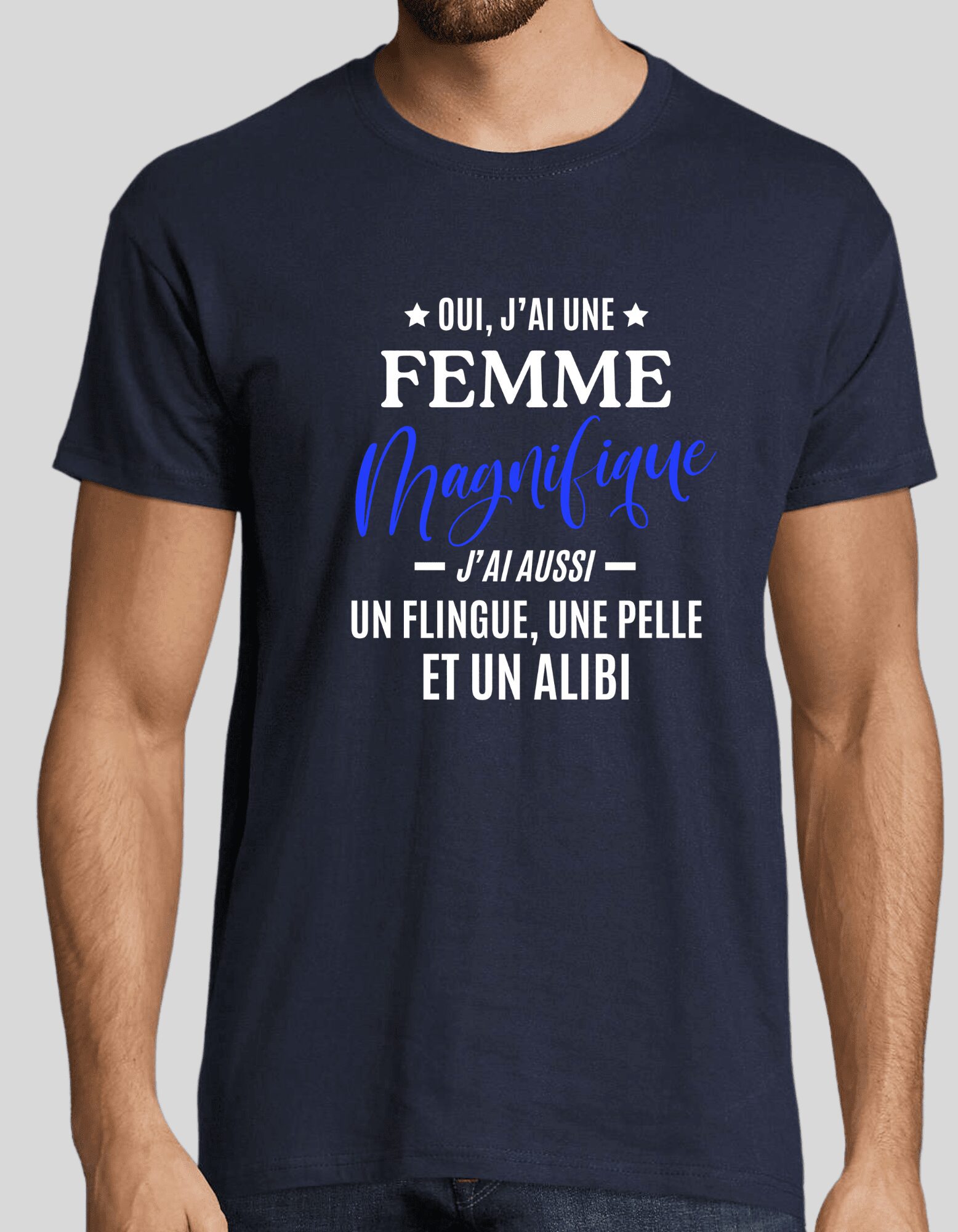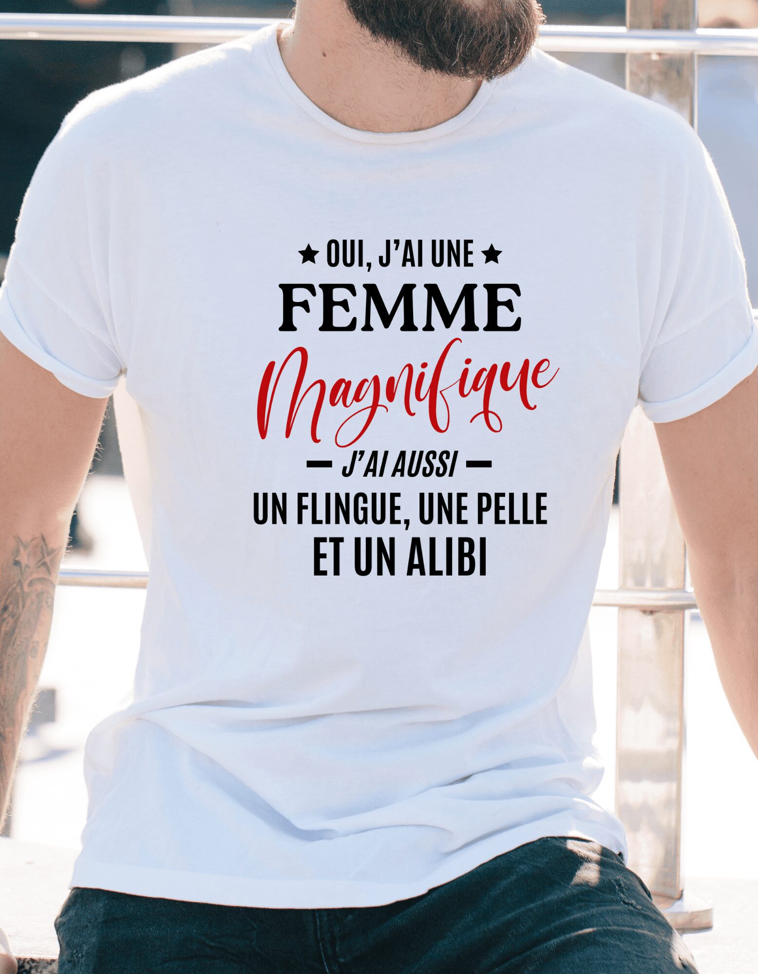 Démarquez-vous avec humour : Tee-shirt Oui j’ai une Femme Magnifique, j’ai aussi un Flingue, une Pelle et un Alibi !