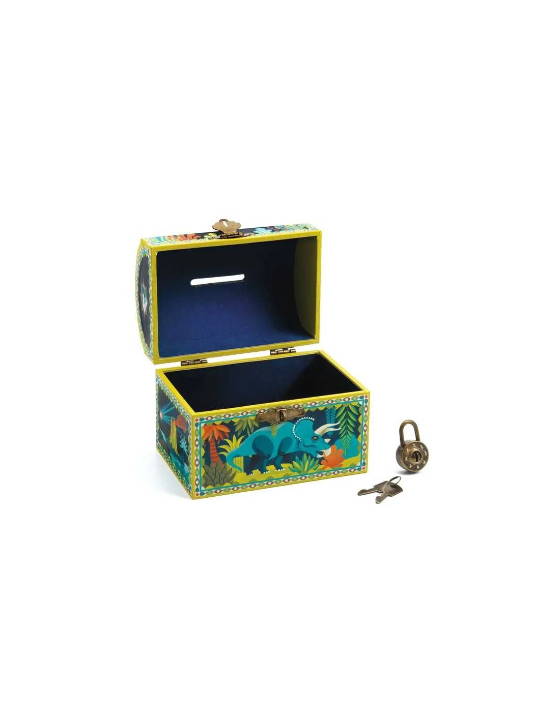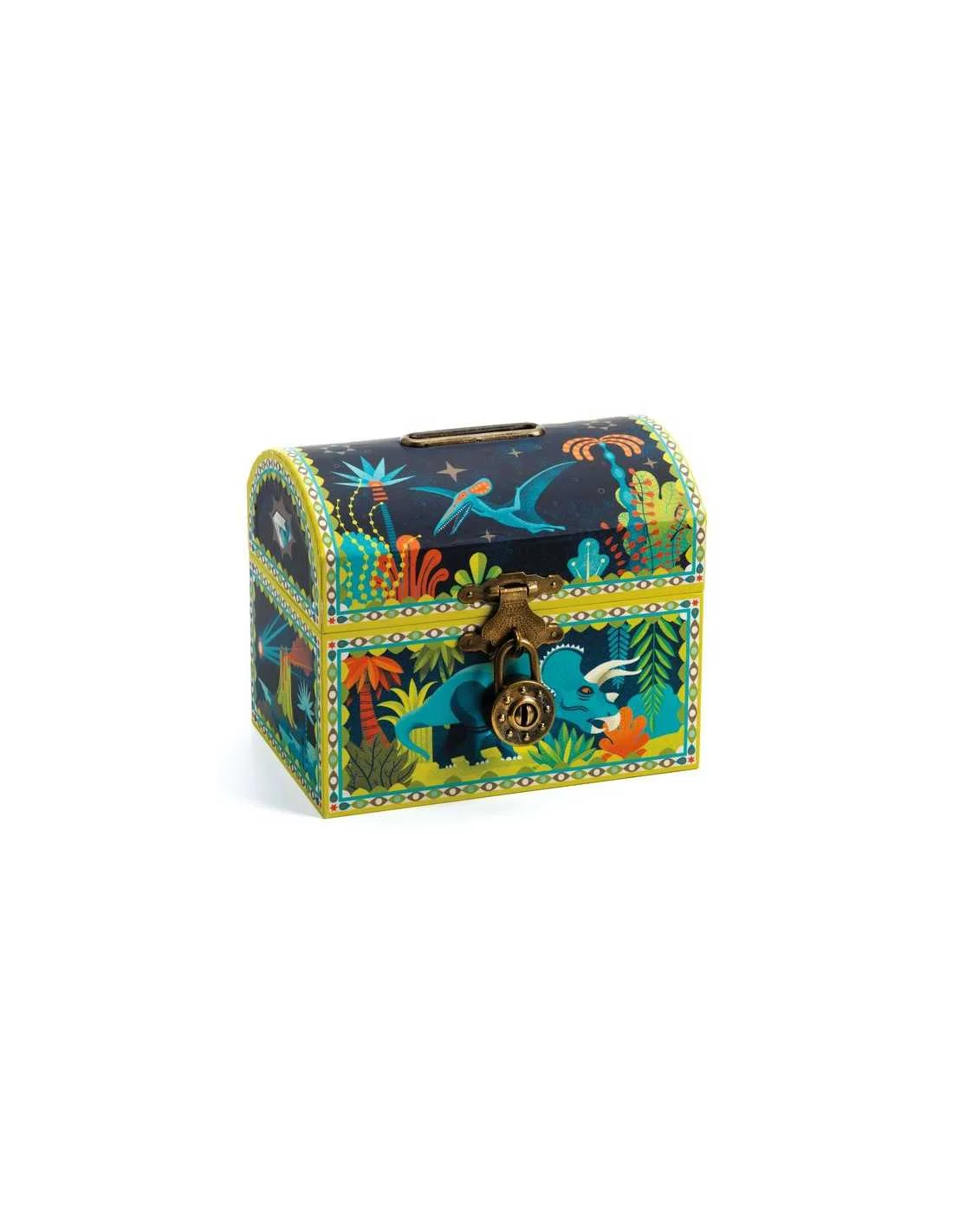 Tirelire Dinosaures, Djeco Une jolie tirelire sur le thème des dinosaures en forme de coffre et décoré avec ces beaux animaux de couleurs gaies. De quoi permettre à vos petits de jolies économies, mais aussi de cacher leurs secrets avec le cadenas.