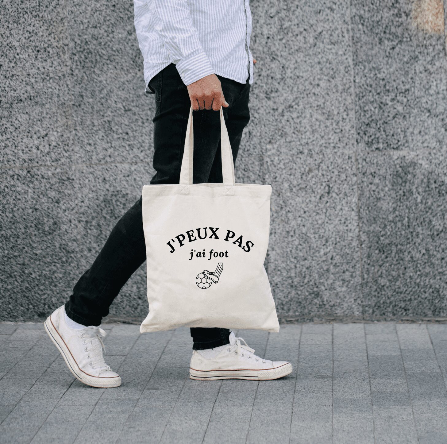 Ce modèle de tote bag pour homme – j’peux pas j’ai foot de TendancedeSan s’adresse à tous les hommes adeptes du foot.