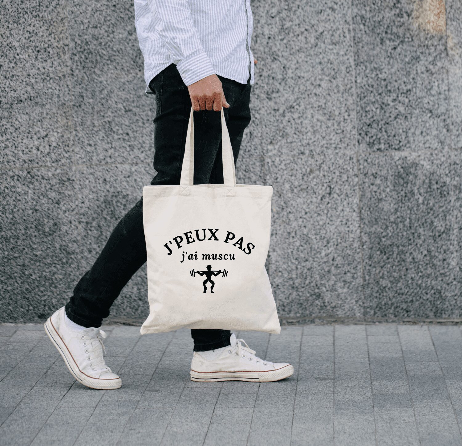 Ce modèle de tote bag pour homme, j’peux pas j’ai muscu de TendancedeSan s’adresse à tous les hommes adeptes de la musculation.