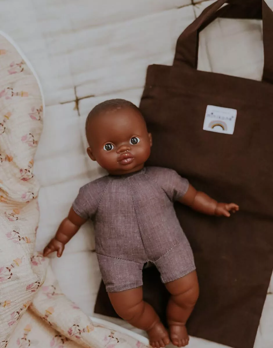 Totebag en coton pour poupées Babies 28cm Minikane. Largeur 19,5cm x Longueur 31cm. Hauteur de la anse : 10cm. Design, développement & confection made in France. Totebag in cotton for dolls. Width 19,5cm x Length 31cm. Height of the handle : 10cm. Design, development & tailoring made in France.