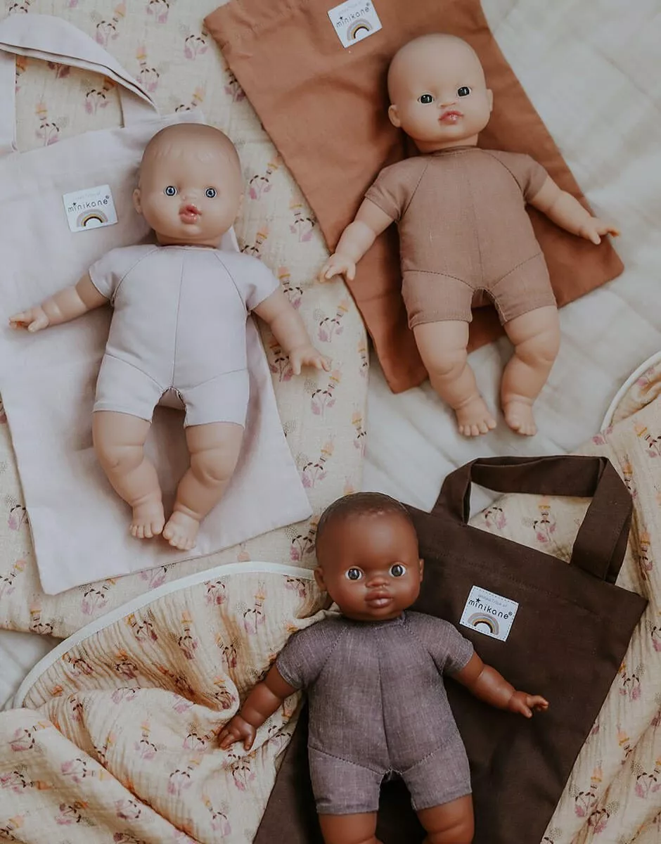 Totebag en coton pour poupées Babies 28cm Minikane. Largeur 19,5cm x Longueur 31cm. Hauteur de la anse : 10cm.