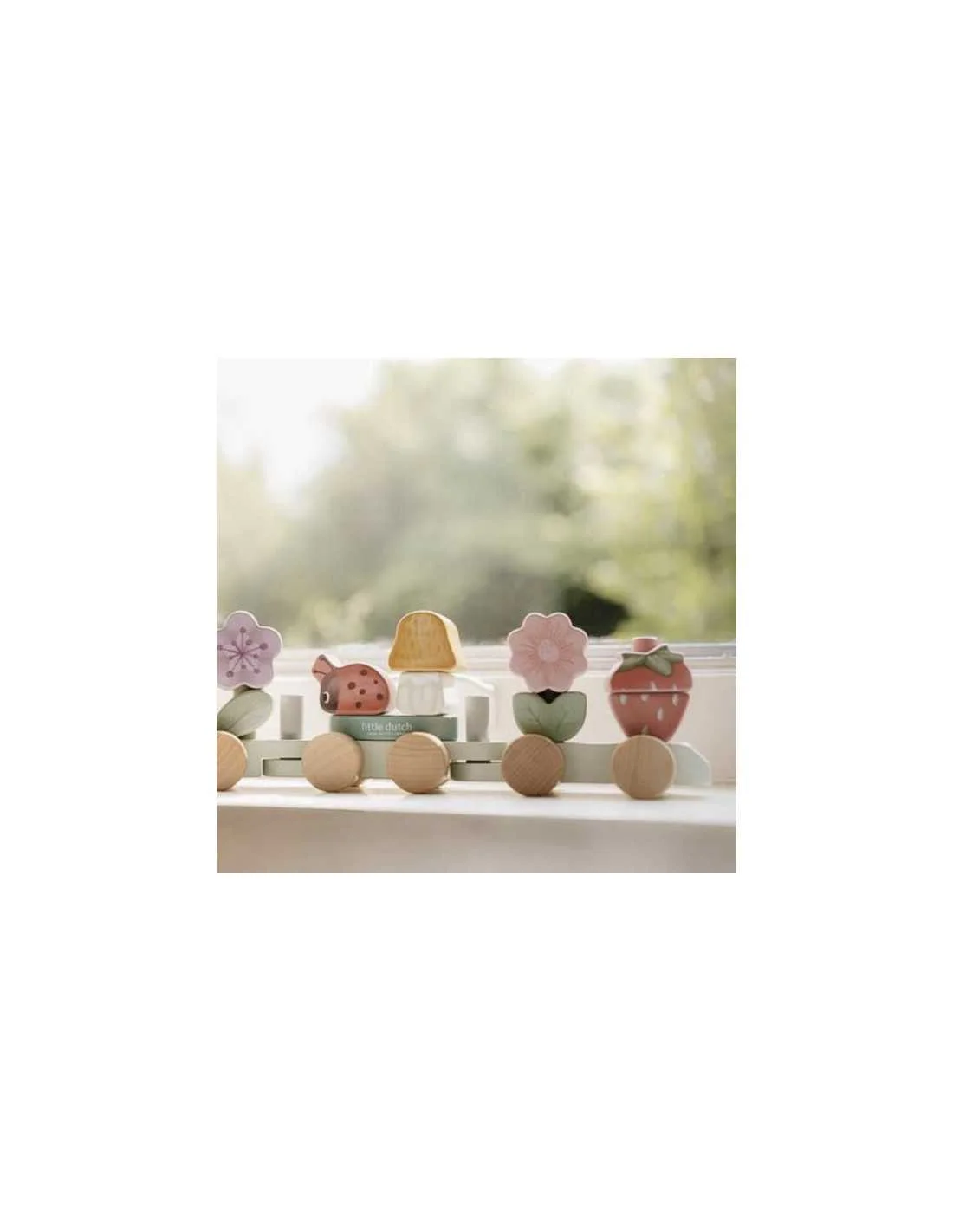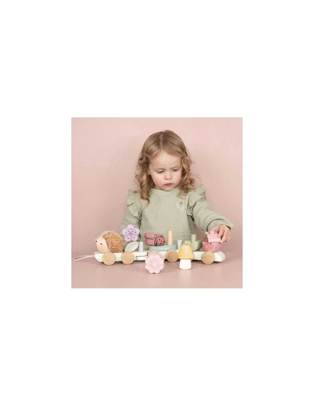 Fabriqué en bois solide, ce train présente des finitions douces et sécurisées pour les jeunes enfants. En outre, ses illustrations délicates inspirées du jardin des fées apportent une touche poétique qui rend le jouet aussi décoratif que ludique.