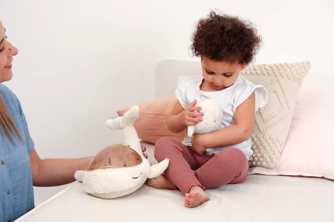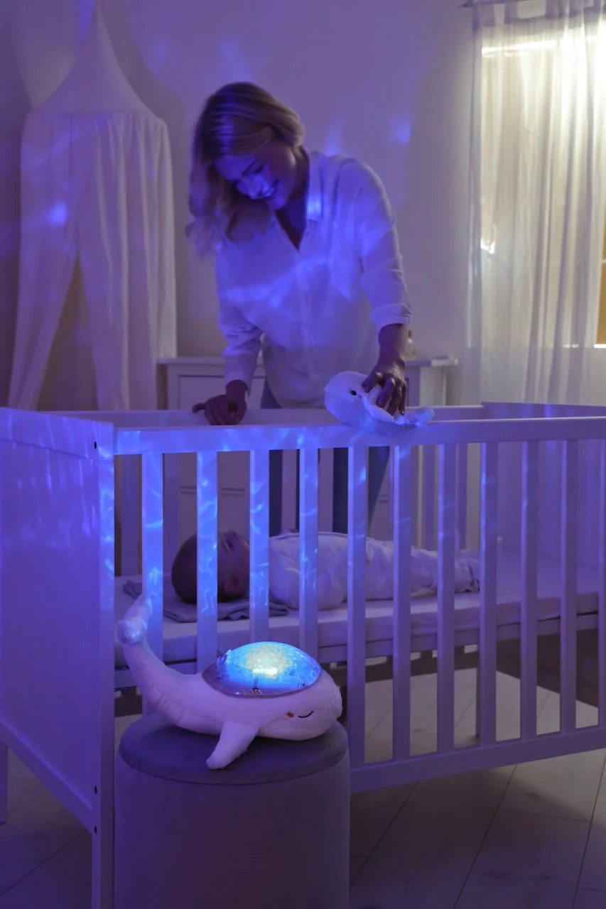 Tranquil Whale™ Family – Blanche- Une veilleuse musicale et son baleineau en peluche. Cette jolie baleine diffuse une douce lumière et projette sur le plafond de la chambre les vagues de l’océan en mouvement grâce à un mécanisme unique et breveté. Une mélodie marine et le son des vagues (bruit blanc) apaiseront les tout-petits pour les emmener sur le chemin du sommeil. Sa matière peluche est ultra-douce. La veilleuse Tranquil Whale™ Family apaise bébé dès sa naissance et rassure les enfants qui ont peur du noir.