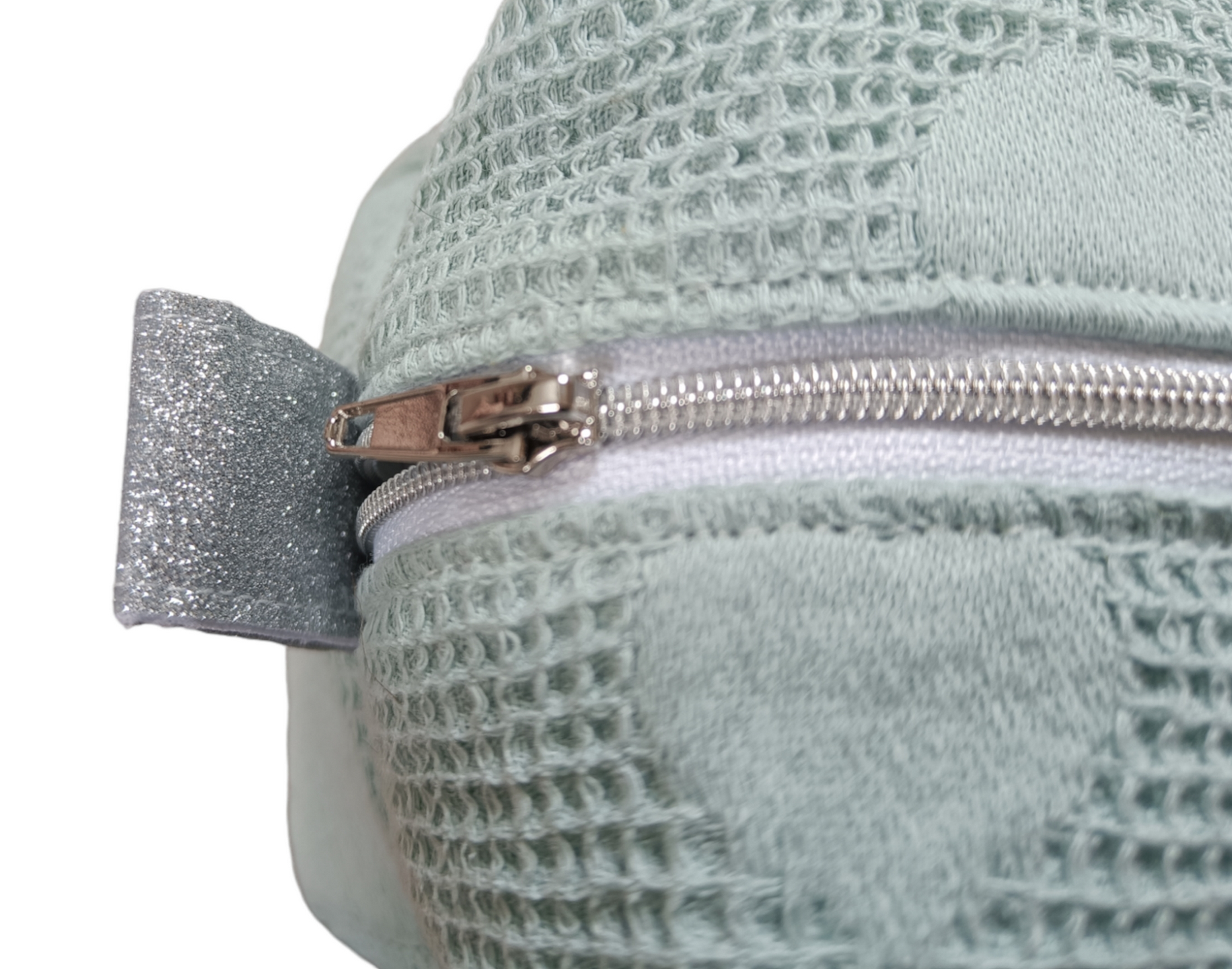 De jolies finitions avec ce coton nid d’abeille à cœur, tirette en tissu pailleté et fermeture éclaire coloris argenté.
