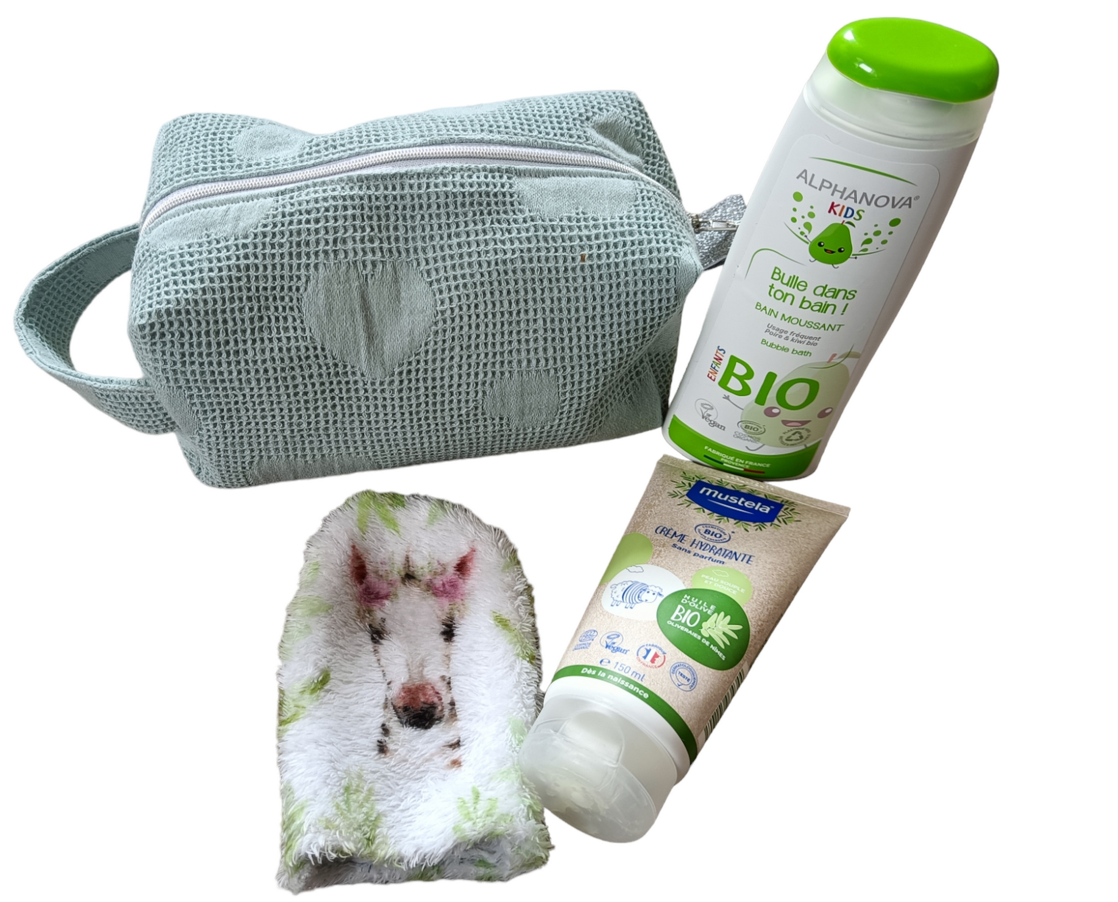 La trousse de toilette bébé, un indispensable! Une trousse dans l’air du temps, indémodable et facile à transporter partout.