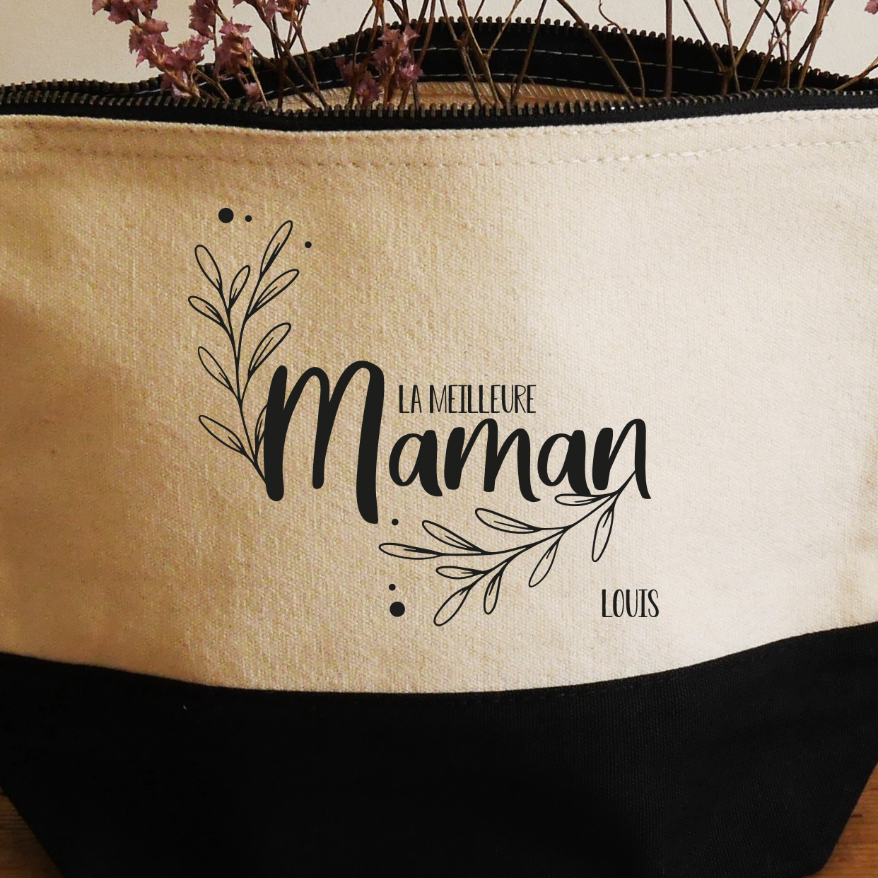 A la recherche d’une idée cadeau pour votre maman ? Cette jolie pochette 100% coton est imprimée en Savoie, dans mon atelier. Vous avez la possibilité de la personnaliser en ajoutant le prénom du ou des enfant(s). Beige et noire. Dimensions: 19 x 18 x 9 cm