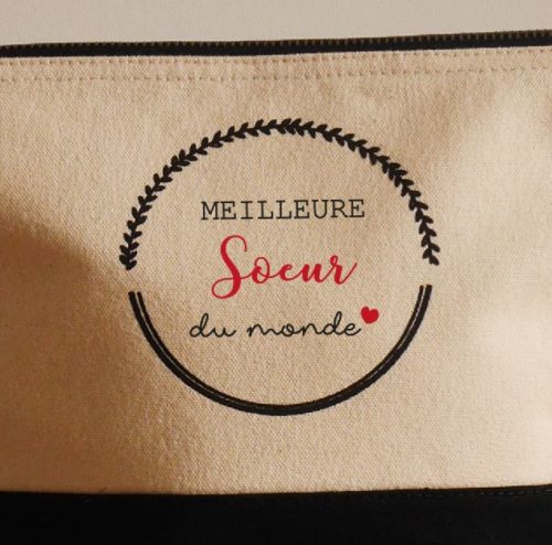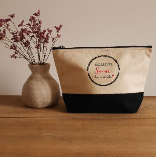 A la recherche d’une idée cadeau pour votre sœur ? Cette jolie pochette 100% coton est imprimée en Savoie, dans mon atelier. Vous avez la possibilité de la personnaliser en ajoutant votre / vos prénom(s) ! Existe noire ou bleue. Dimensions : 19 x 18 x 9cm