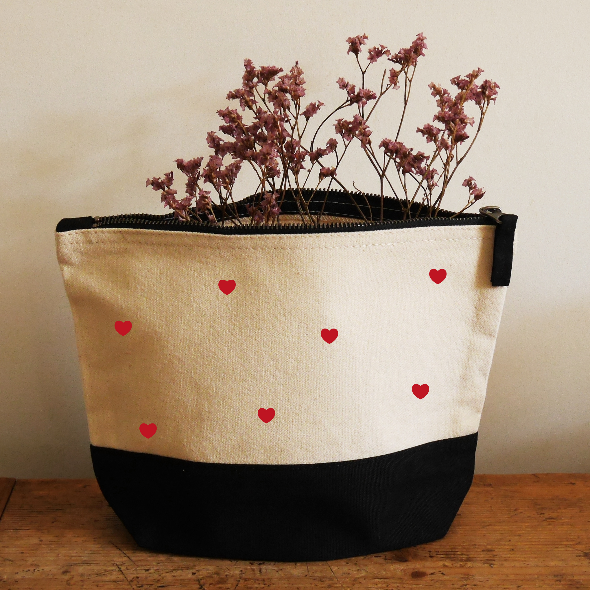 Edition limitée – Saint Valentin Cette jolie pochette 100% coton est imprimée en Savoie, dans mon atelier. Vous avez la possibilité de la personnaliser en ajoutant un prénom, le petit surnom de votre moitié, ou un mot qui vous plaît pour un cadeau de vous à vous. Beige et noire. Dimensions: 19 x 18 x 9 cm