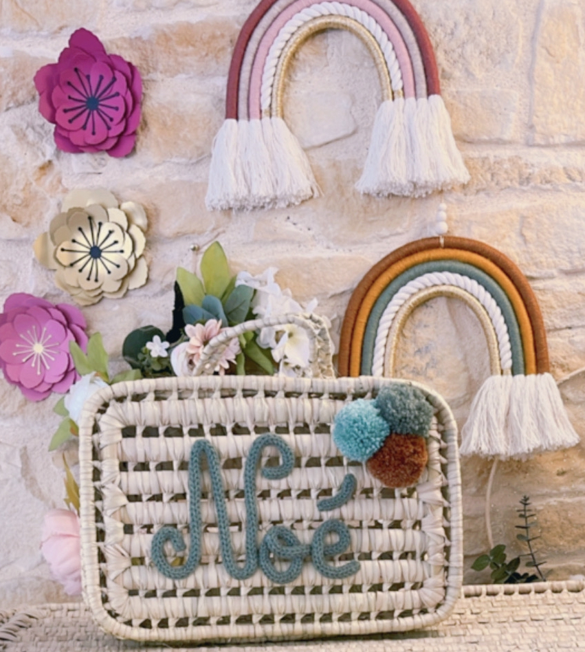 Valisette à souvenirs avec pompons Petite valisette à souvenirs en feuille de palme tressé. Idéal pour la décoration mais surtout pour y ranger tous les plus beaux souvenirs depuis la naissance de bébé. Dimensions +/- 30cm de long, 22cm de haut et 12cm de large Prénom et arc en ciel en laine fixés. Article fait […]