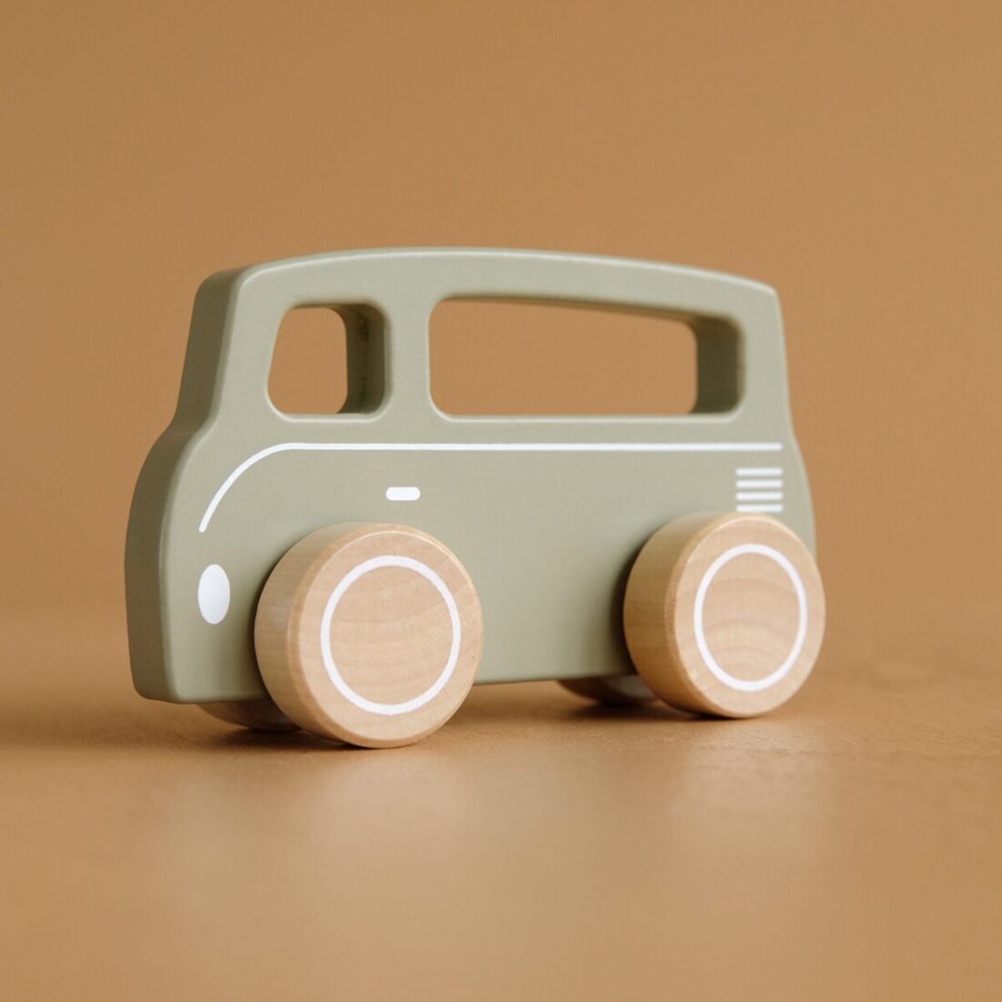 Cette petite camionnette en bois Little Dutch de couleur olive roule gaiement grâce à ses roues en bois solides. Elle a deux autres amis : une voiture et une voiture de sport. Très sympa comme accessoire dans une chambre de bébé ou d’enfant.