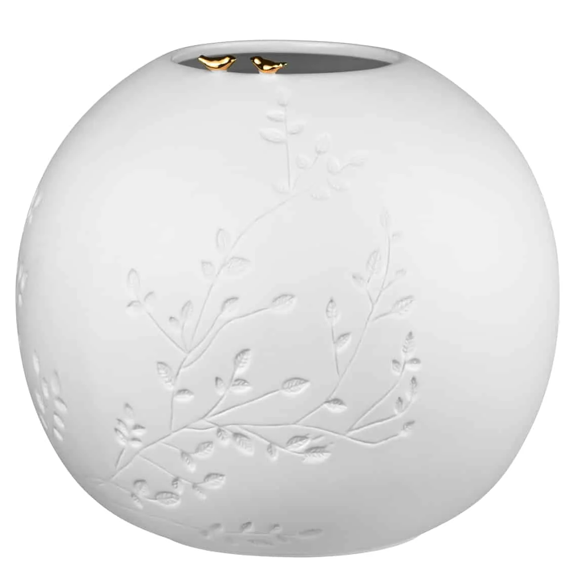 Vase Boule Oiseau Doré, Räder Vase BOULE en porcelaine émaillée à l’intérieur pour de délicats bouquets . Sur la partie non émaillée, incrustations de feuilles et deux délicats petits oiseaux dorés à la main, qui reposent sur le bord du vase . A panacher avec les vases et les coupelles tous plus raffinés des collections de la marque .