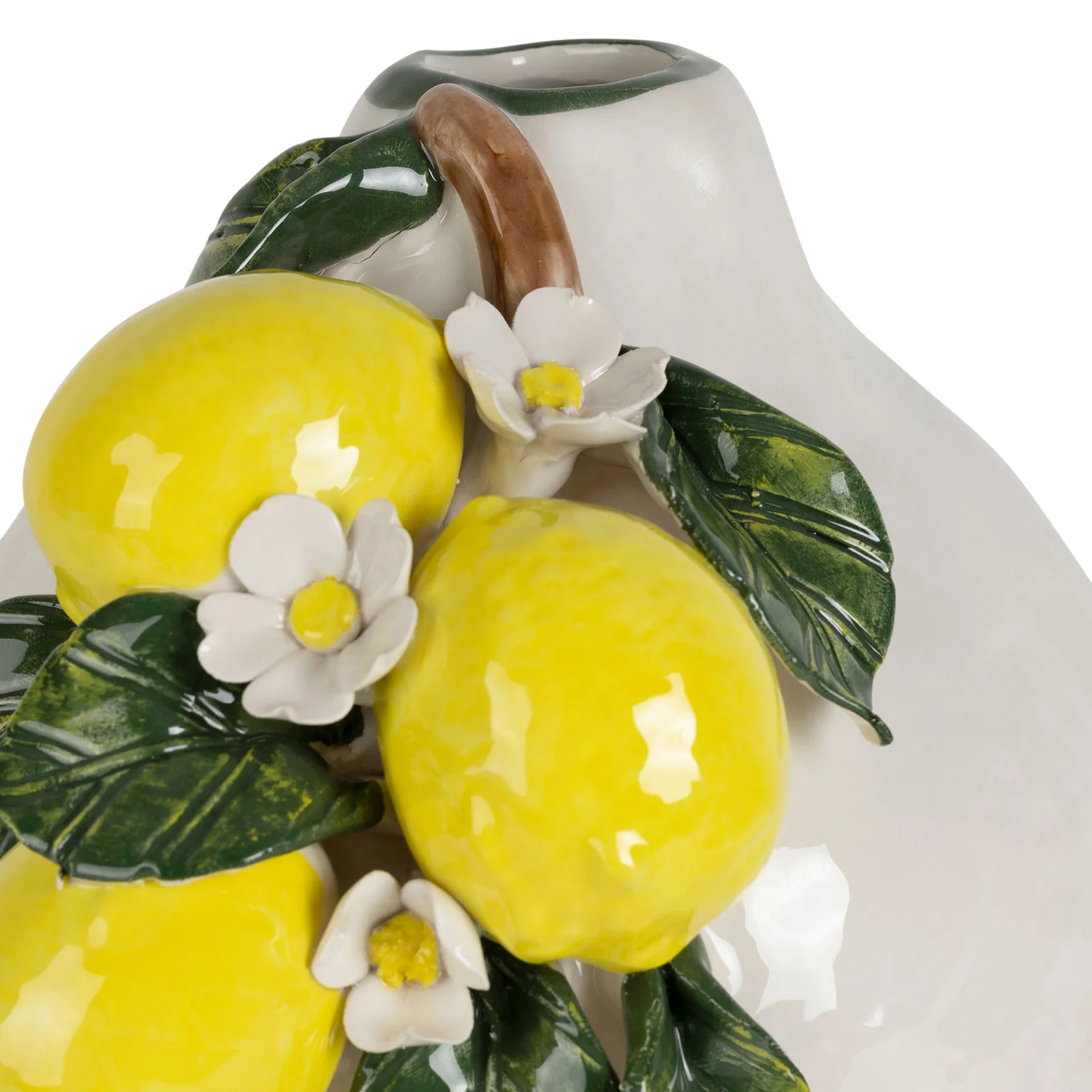 Détails en relief ultra-réalistes : citrons, feuilles et fleurs en céramique