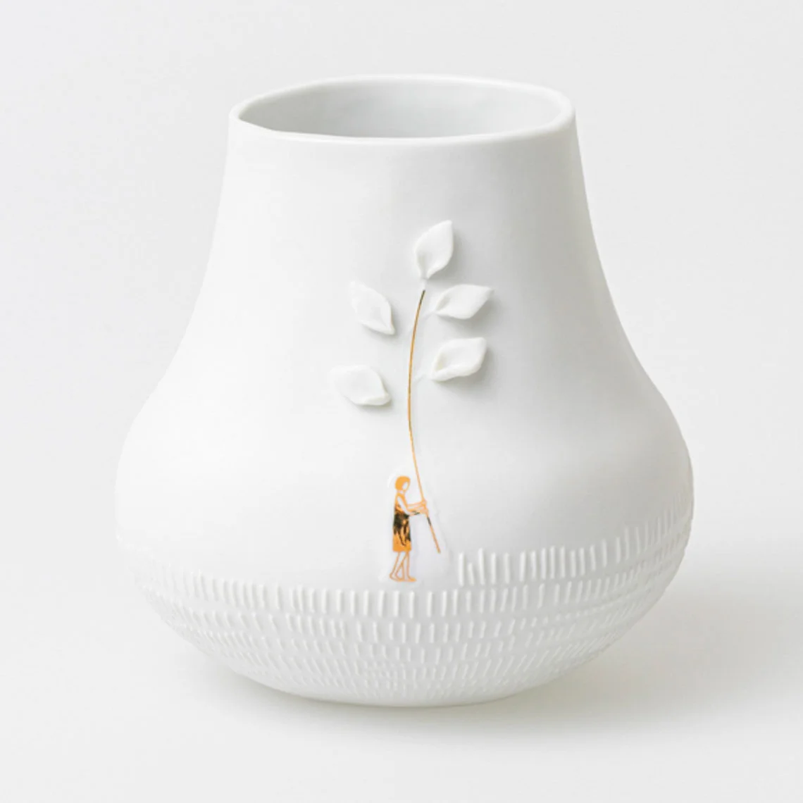 Vase en porcelaine blanche avec gravure féminine et feuille dorée en relief. Un objet élégant et sensible, parfait pour accueillir vos plus belles fleurs. Signé Räder. Dimensions : H 11 cm x Ø 11 cm