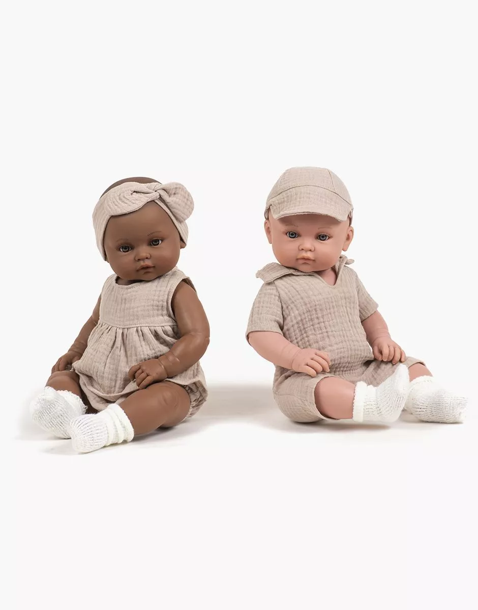 Yann, poupon 47cm habillĂ© de son ensemble combinaison Tom et casquette en double gaze avec paire de chaussettes Ă©cru. Poupon en vinyle sans phtalates. Compatible avec l’ensemble du dressing Bambinis.