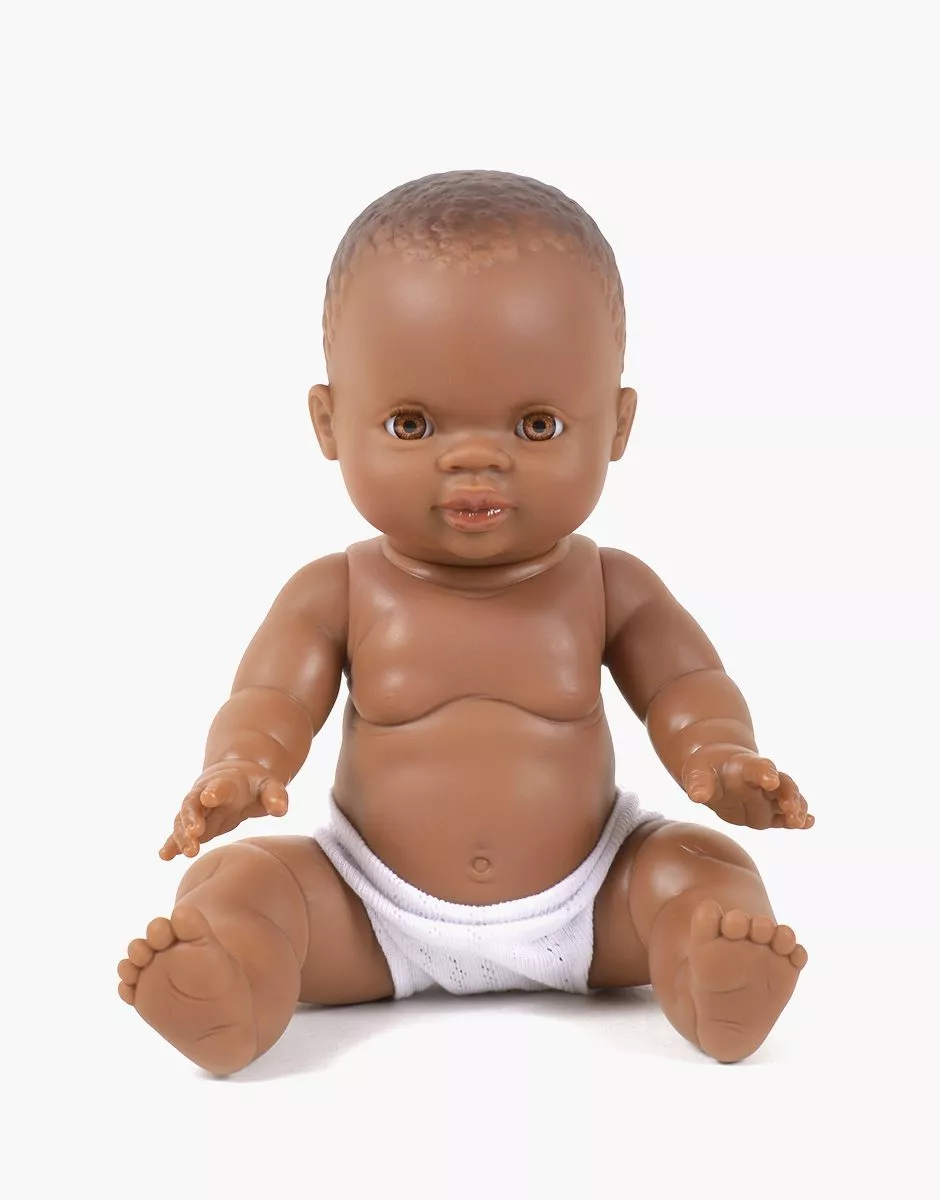 Zélie petite fille d’Afrique aux yeux miels, poupée Gordis sans cheveux exclusive Minikane, vendue sans culotte. – Taille de 34cm avec jambes pliées (ne tient pas debout) – Yeux couleur ambre – Logotée « Minikane » derrière la nuque Poupée en vinyle sans phtalate et parfumée à la vanille. Compatible avec l’ensemble des vêtements et accessoires Gordis.
